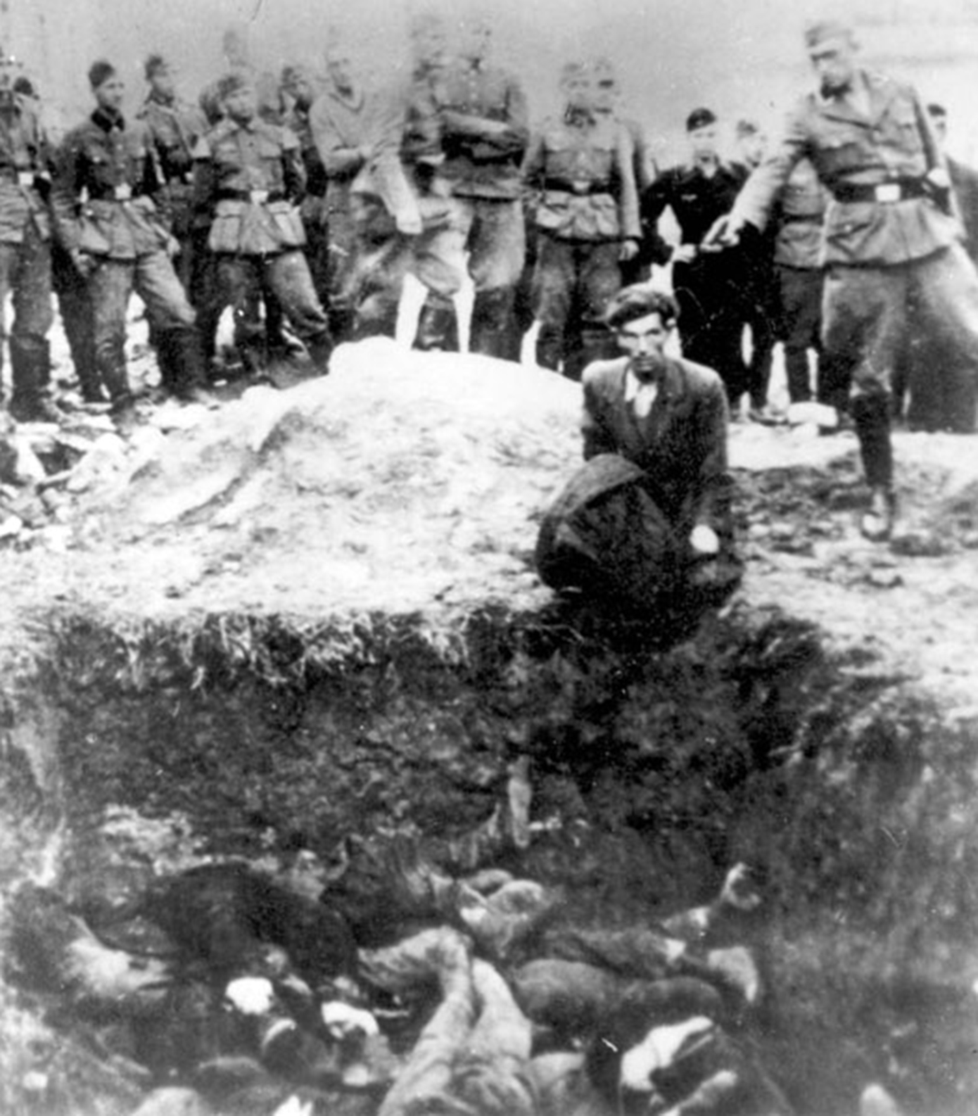 Στην ανατριχιαστική φωτογραφία, που τραβήχτηκε στη σημερινή Ουκρανία, ένας ναζί εκτελεστής με γυαλιά σημαδεύει με το όπλο του έναν άνδρα που γονατίζει μπροστά σε έναν μαζικό τάφο, ενώ άλλοι στρατιώτες των SS παρακολουθούν, όπως αναφέρει το δημοσίευμα της nypost. Η ταυτότητα του εκτελεστή παρέμενε άγνωστη για δεκαετίες, μέχρι που ο Μάτιους αποκάλυψε πως πρόκειται για τον Γιάκομπους Όνεν (Jakobus Onnen), καθηγητή γαλλικών, αγγλικών και γυμναστικής, γεννημένο το 1906 στο Τίχελβαρφ της Γερμανίας.