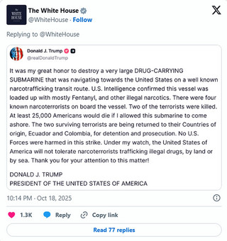 «Ηταν μεγάλη μου τιμή να καταστρέψω ένα πολύ μεγάλο ΥΠΟΒΡΥΧΙΟ ΜΕΤΑΦΟΡΑΣ ΝΑΡΚΩΤΙΚΩΝ που κατευθυνόταν προς τις Ηνωμένες Πολιτείες επί πολύ γνωστού διαύλου. Οι αμερικανικές υπηρεσίες Πληροφοριών επιβεβαίωσαν ότι το σκάφος ήταν φορτωμένο κυρίως με Fentanyl και άλλα παράνομα ναρκωτικά», έγραψε ο Τραμπ στο Truth Social.