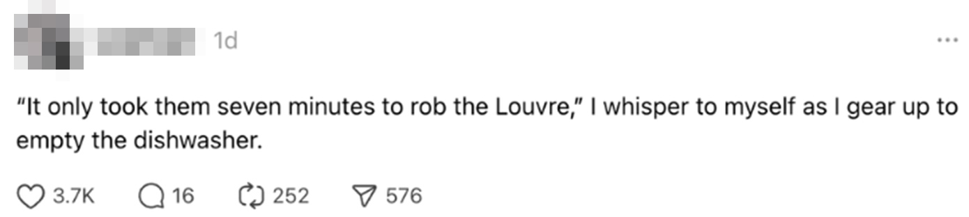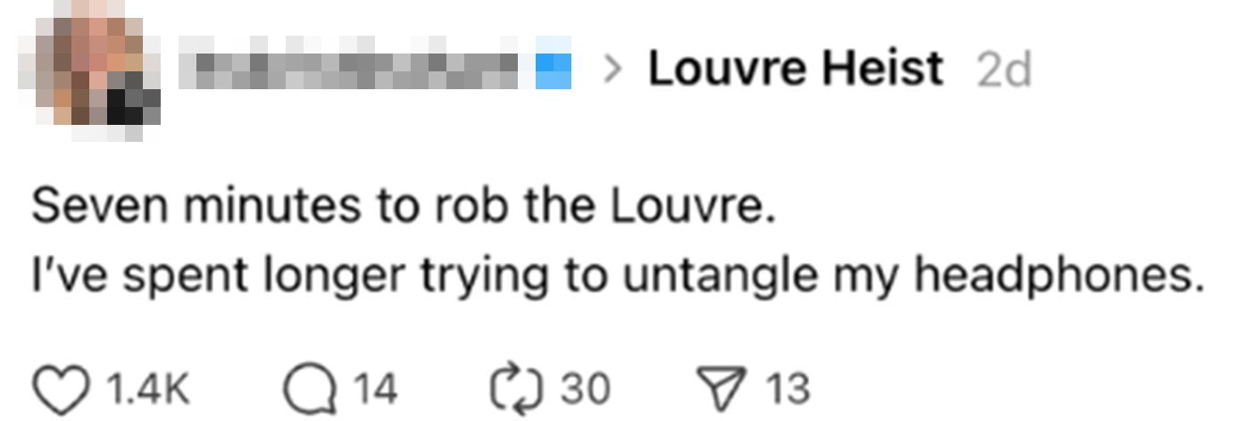 Άλλος είπε: «Επτά λεπτά για να ληστέψουν το Λούβρο. Κάνω περισσότερη ώρα να ξεμπλέξω τα ακουστικά μου».