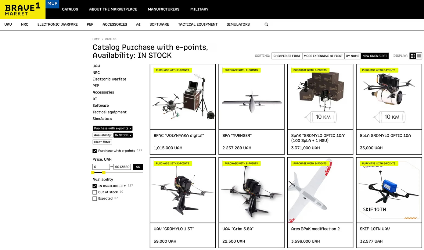 Μέσω της ιστοσελίδας Brave1 που λειτουργεί σαν την Amazon, αλλά προσφέροντας μόνο όπλα, οι ενδιαφερόμενοι Ουκρανοί στρατιώτες μπορούν να διαλέξουν ανάμεσα σε 100 διαφορετικά drones, όπλα κτλ. Ακόμη, μπορεί να ζητήσουν ενισχύσεις σε στρατιώτες, αν θεωρούν ότι πρέπει να επεκταθεί η μονάδα τους.