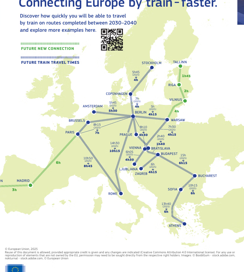 Βασιζόμενο στο Διευρωπαϊκό Δίκτυο Μεταφορών (TEN-T), το σχέδιο προβλέπει τη σύνδεση βασικών κόμβων με ταχύτητες 200 χλμ./ώρα και άνω. Οι επιβάτες θα μπορούν να ταξιδεύουν από το Βερολίνο στην Κοπεγχάγη σε τέσσερις ώρες αντί για επτά σήμερα, και από τη Σόφια στην Αθήνα σε έξι ώρες αντί για 13 ώρες και 40 λεπτά. Νέες διασυνοριακές συνδέσεις θα επιτρέψουν επίσης ταχύτερα ταξίδια, όπως Παρίσι–Λισαβόνα μέσω Μαδρίτης, καθώς και καλύτερη διασύνδεση μεταξύ των πρωτευουσών της Βαλτικής.
