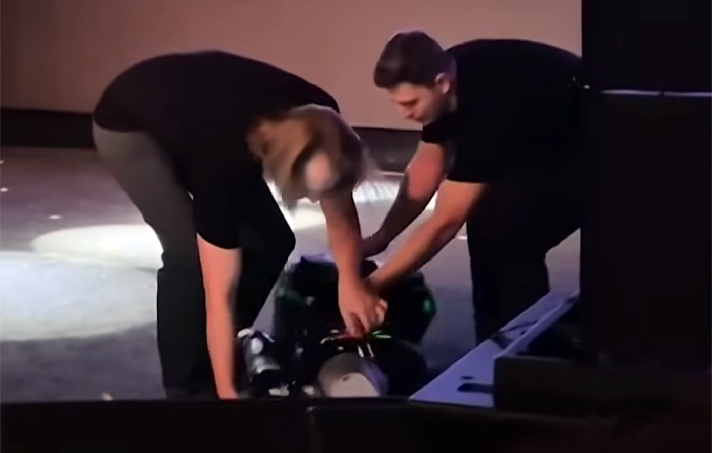 Το ρομπότ σήκωσε το χέρι του για να χαιρετήσει, όμως τα πράγματα πήραν άμεσα άσχημη τροπή όταν παραπάτησε, έκανε μερικά ασταθή βήματα και στη συνέχεια σωριάστηκε με δύναμη στο δάπεδο της σκηνής. Κομμάτια από το σώμα του έσπασαν και εκτοξεύτηκαν, ενώ το ρομπότ τρανταζόταν στο έδαφος, την ώρα που οι στίχοι του τραγουδιού του «Rocky» άρχισαν να ακούγονται: «Trying hard now! It’s so hard now!».