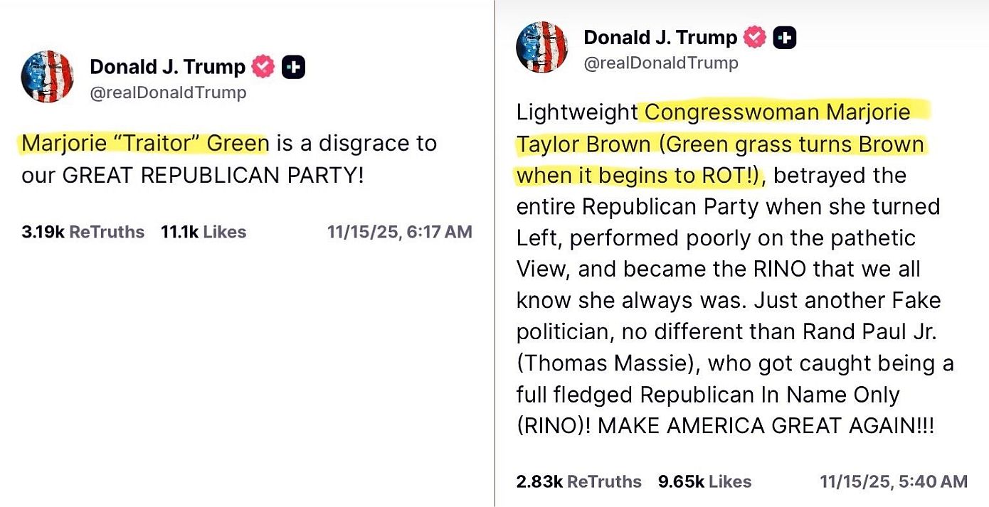 Σήμερα, ο ίδιος στοχοποίησε ξανά την Γκριν σε δύο αναρτήσεις στο Truth Social.