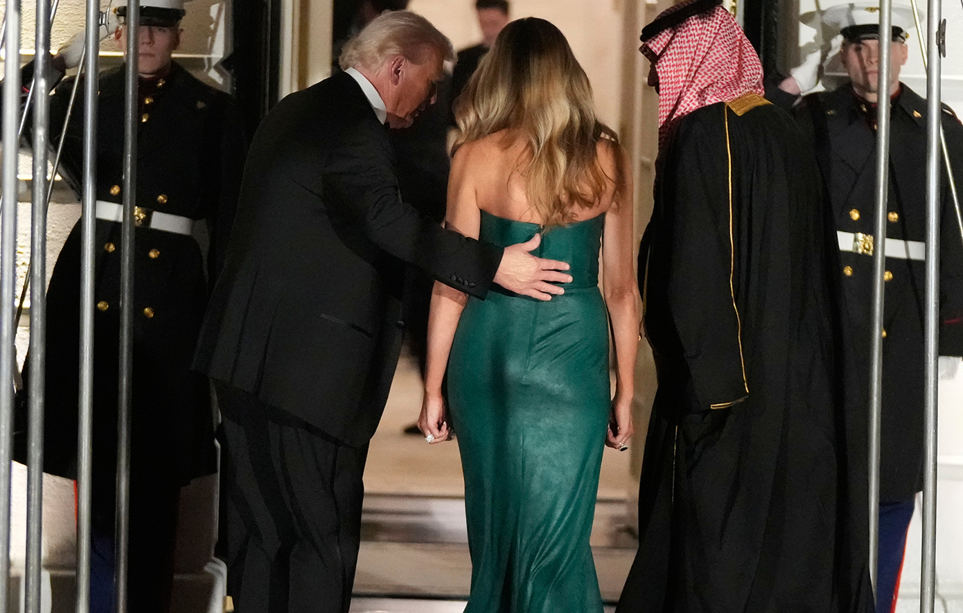 Παρά το ψυχρό και βροχερό σκηνικό Ουάσινγκτον, η Μελάνια παρέμεινε αψεγάδιαστη, κρατώντας το χέρι του συζύγου της, τη στιγμή που το μαύρο όχημα του Σαουδάραβα πρίγκιπα έφτασε στην είσοδο. Σύμφωνα με την DailyMail, το σμαραγδί φόρεμα είναι δημιουργία του Elie Saab αξίας 3.350 δολαρίων, ερμηνεύτηκε από πολλούς ως μια προσεκτικά υπολογισμένη χειρονομία υποστήριξης προς τον Μοχάμεντ μπιν Σαλμάν.