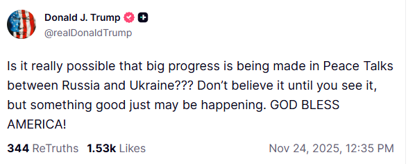 Η ανάρτηση του Αμερικανού προέδρου έρχεται καθώς σημειώνονται εξελίξεις στο Ουκρανικό τις τελευταίες ημέρες, μετά την αποκάλυψη του σχεδίου 28 σημείων για ειρήνη, αλλά και της αντιπρότασης που έκανε η ΕΕ με τροποποιήσεις, μετά από ανησυχίες για το περιεχόμενο της αμερικανικής πρότασης.