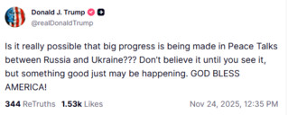 «Είναι πραγματικά δυνατόν να σημειώνεται μεγάλη πρόοδος στις ειρηνευτικές συνομιλίες μεταξύ Ρωσίας και Ουκρανίας;;; Μην το πιστέψετε μέχρι να το δείτε, αλλά ίσως να συμβαίνει κάτι καλό. Ο ΘΕΟΣ ΝΑ ΕΥΛΟΓΕΙ ΤΗΝ ΑΜΕΡΙΚΗ!»