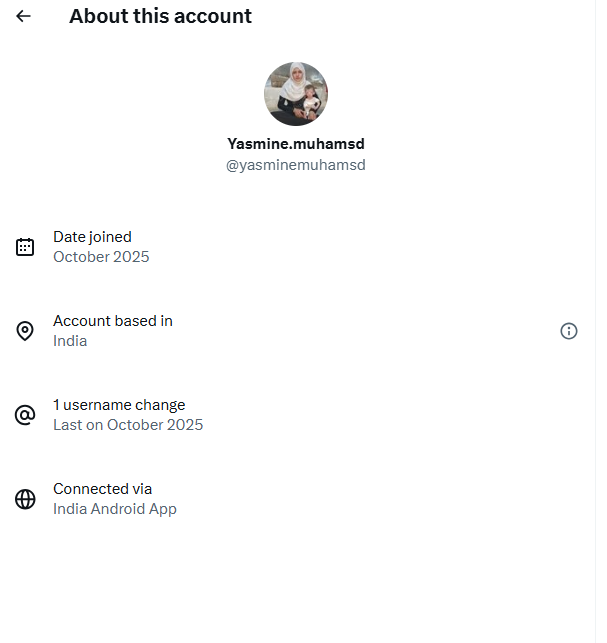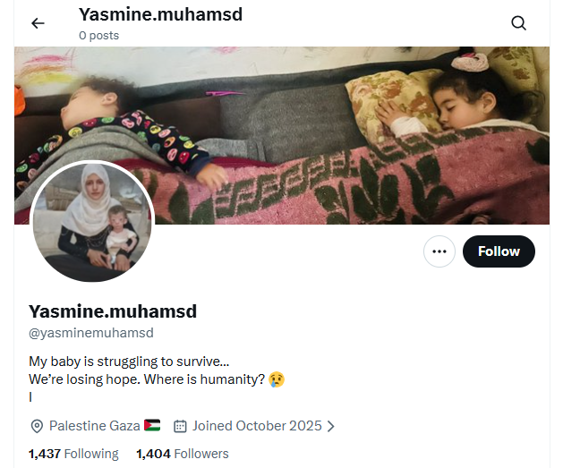 Πολλές αναρτήσεις στον λογαριασμό περιλαμβάνουν φωτογραφίες μιας κλαμένης Παλαιστίνιας που κρατάει το πεινασμένο νεογέννητό της ζητώντας δωρεές. Παρά τους ισχυρισμούς για αναρτήσεις από τη Γάζα, ο δείκτης τοποθεσίας του X εντοπίζει τον λογαριασμό στην Ινδία.