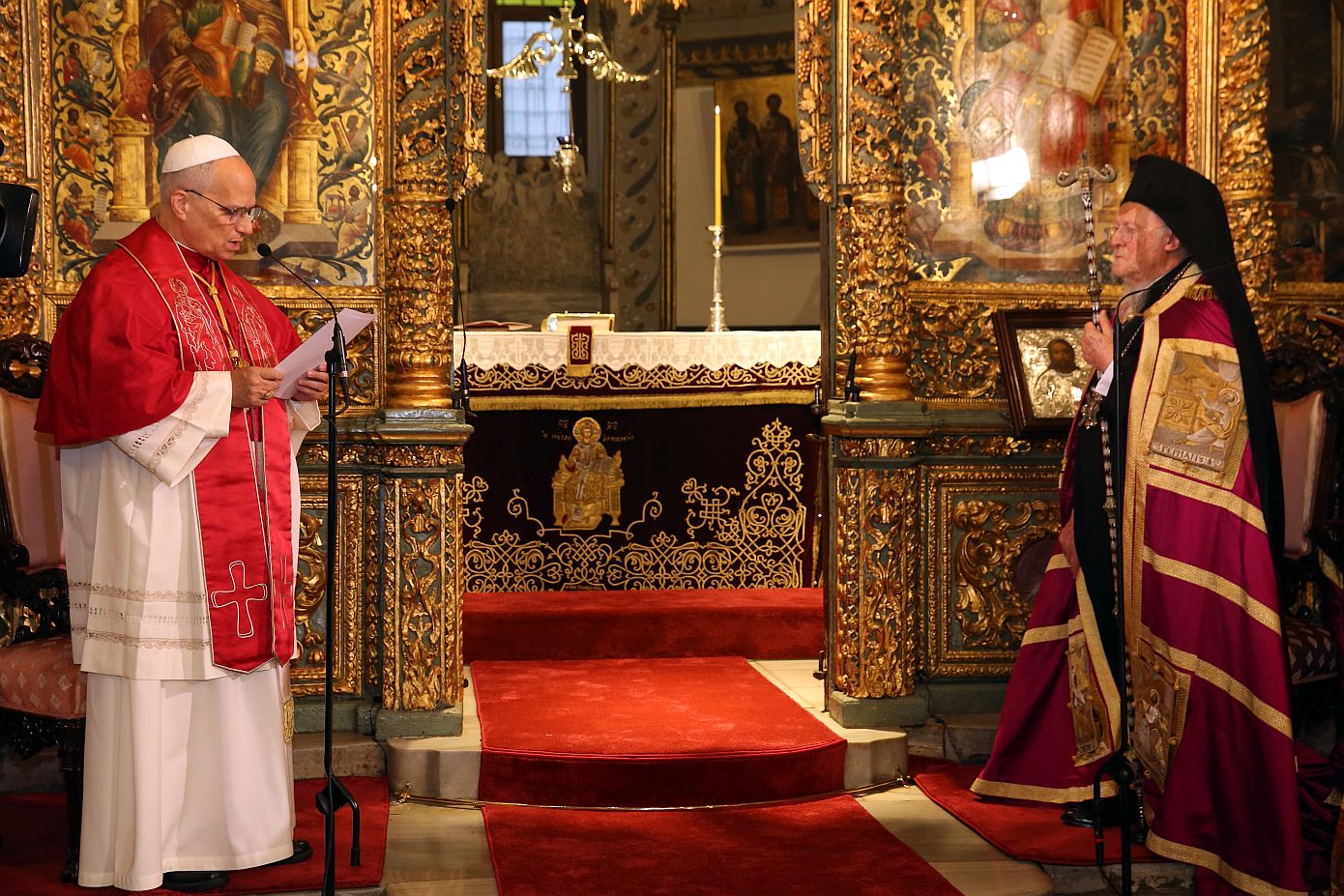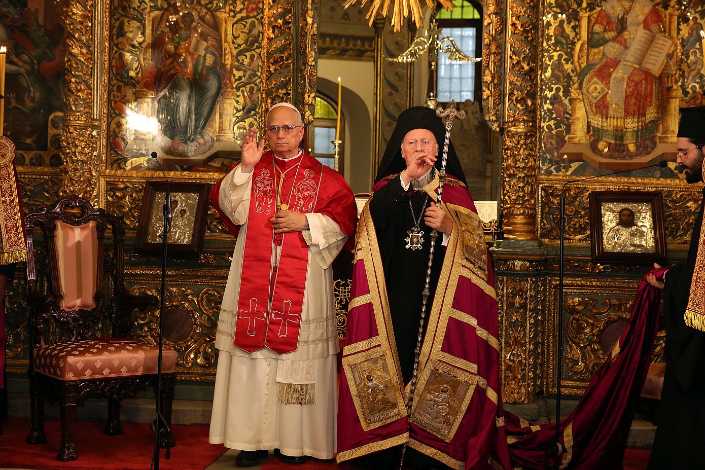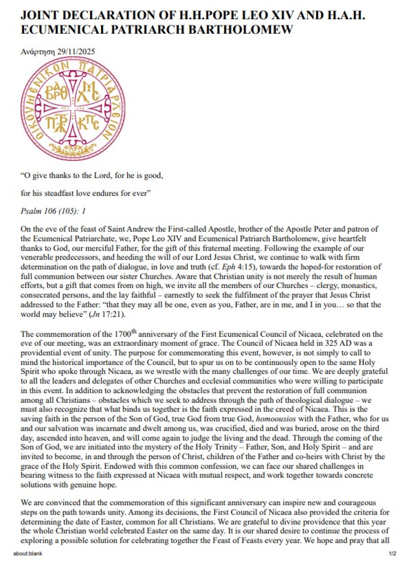 O Οικουμενικός Πατριάρχης Βαρθολομαίος και ο Πάπας Λέων ΙΔ’ υπέγραψαν σήμερα στο Φανάρι Κοινή Διακήρυξη, επιβεβαιώνοντας τη δέσμευσή τους για την πλήρη κοινωνία και απορρίπτοντας κατηγορηματικά τη χρήση της θρησκείας για την αιτιολόγηση της βίας.