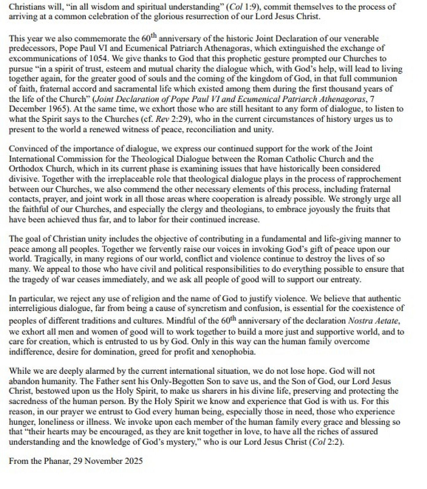 Ο Πατριάρχης Βαρθολομαίος και ο Πάπας Λέων υπενθυμίζουν ότι η αναζήτηση της πλήρους κοινωνίας δεν βασίζεται στην ανθρώπινη διπλωματία, αλλά στην υπακοή στην προσευχή του Κυρίου στο Ευαγγέλιο του Ιωάννη «ἵνα πάντες ἓν ὦσι, καθὼς σύ, πάτερ, ἐν ἐμοὶ κἀγὼ ἐν σοί, ἵνα καὶ αὐτοὶ ἐν ἡμῖν ἓν ὦσιν, ἵνα ὁ κόσμος πιστεύσῃ» («για να είναι όλοι ένα, όπως εσύ, Πατέρα, είσαι σε μένα και εγώ σε σένα, ώστε ο κόσμος να πιστέψει»).