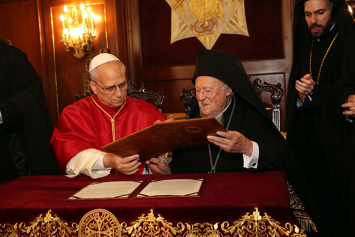 Ο Οικουμενικός Πατριάρχης και ο Πάπας υπέγραψαν σήμερα την Κοινή Διακήρυξη στην Αίθουσα του Θρόνου του Πατριαρχικού Οίκου, αμέσως μετά τη Δοξολογία στον πατριαρχικό ναό του Αγίου Γεωργίου.