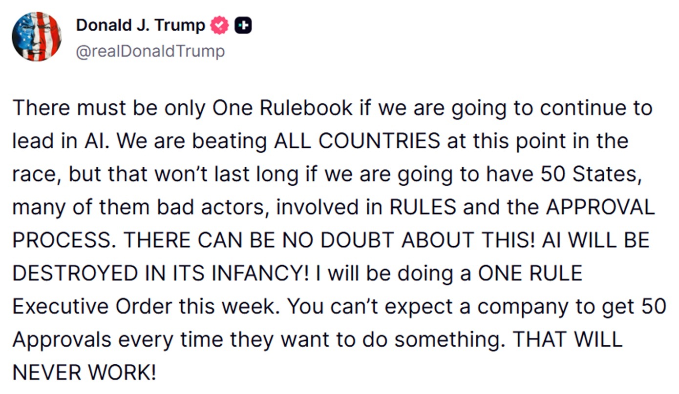 «Πρέπει να υπάρχει μόνο Ένα Εγχειρίδιο Κανόνων αν θέλουμε να συνεχίσουμε να ηγούμαστε στην Τεχνητή Νοημοσύνη… Θα εκδώσω αυτή την εβδομάδα ένα Εκτελεστικό Διάταγμα ΕΝΟΣ ΚΑΝΟΝΙΣΜΟΥ. Δεν μπορείτε να περιμένετε από μια εταιρεία να λαμβάνει 50 Εγκρίσεις κάθε φορά που θέλει να κάνει κάτι», τόνισε ο Τραμπ σε ανάρτηση στο Truth Social.