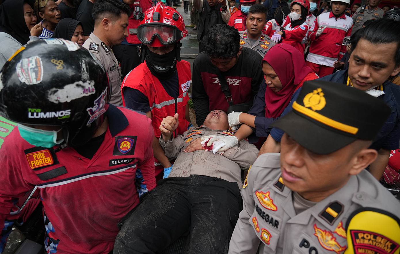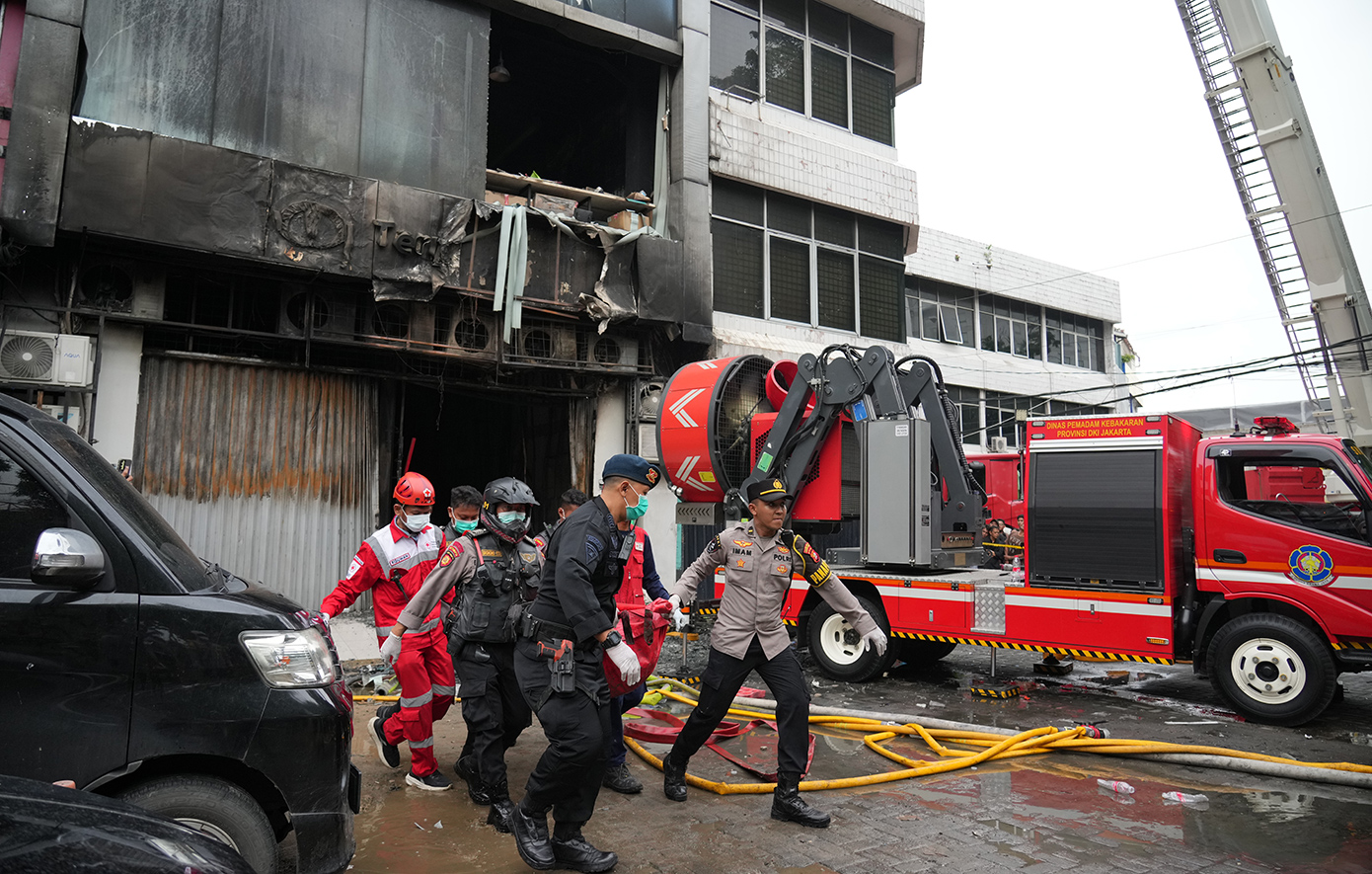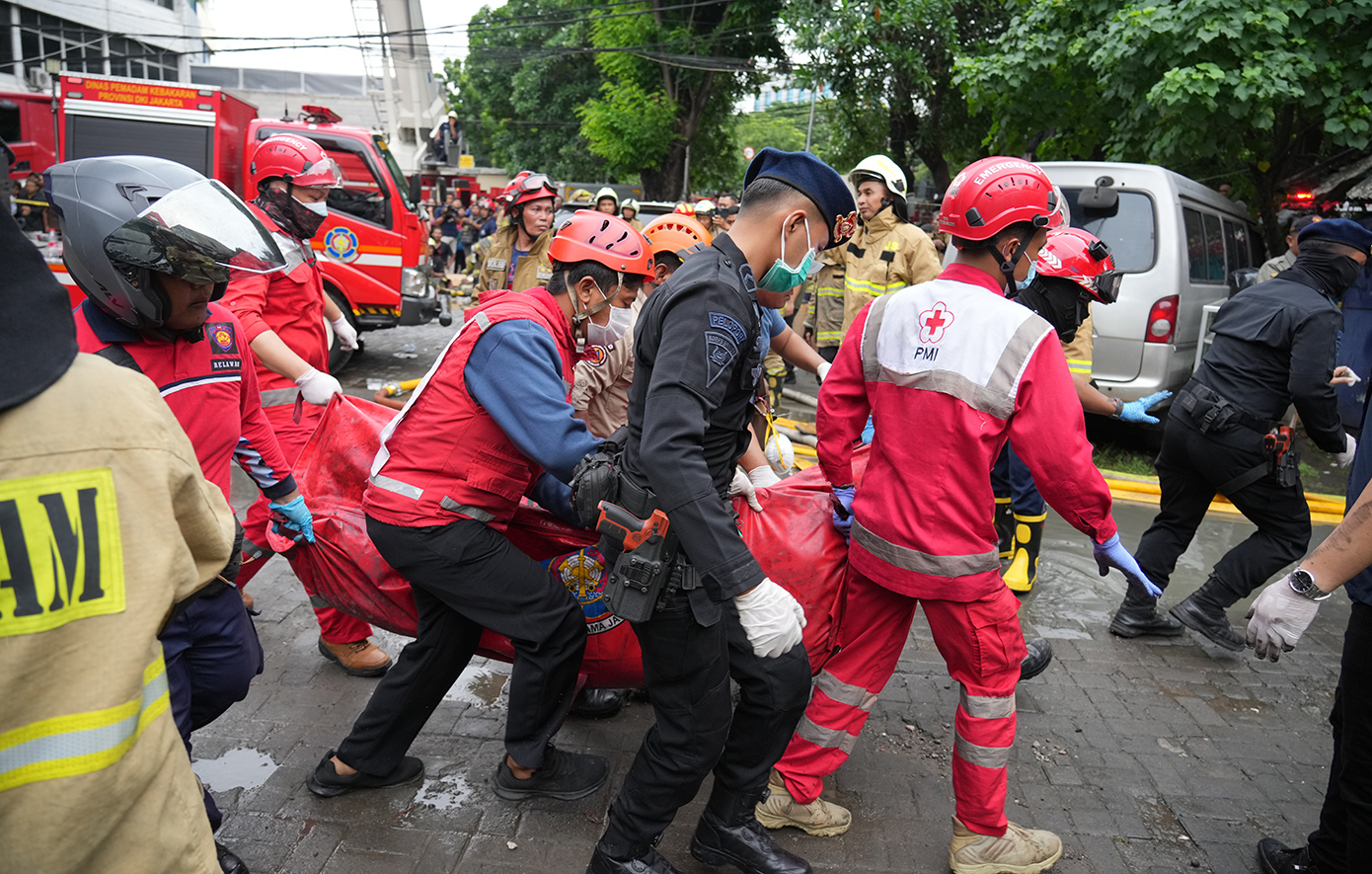 Οπτικό υλικό, που προβλήθηκε από το Kompas TV, δείχνει δεκάδες πυροσβέστες να προσπαθούν να απομακρύνουν ανθρώπους από το κτίριο και κάποιους να μεταφέρουν εκτός κτιρίου σάκους για πτώματα.