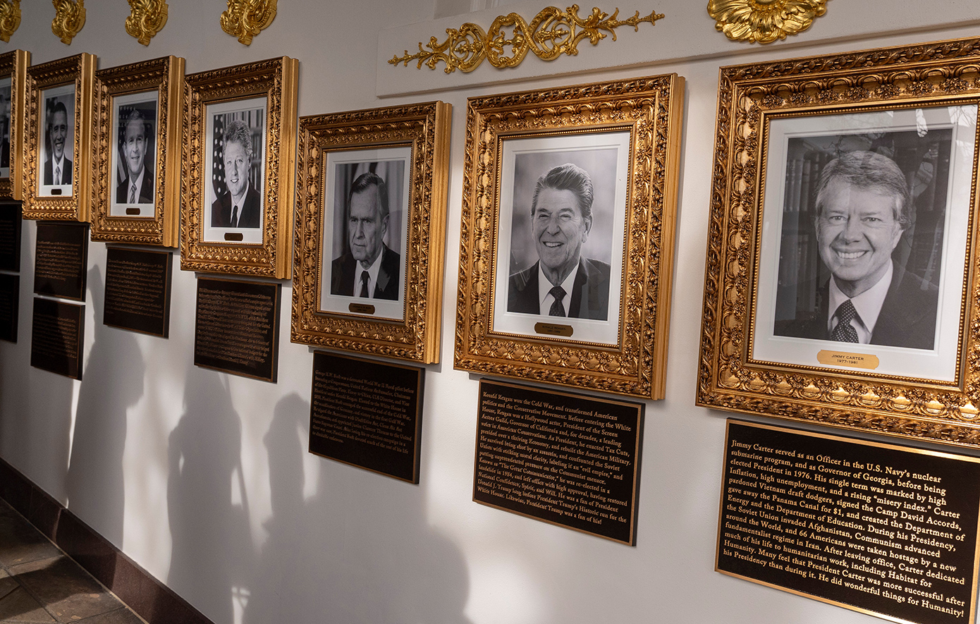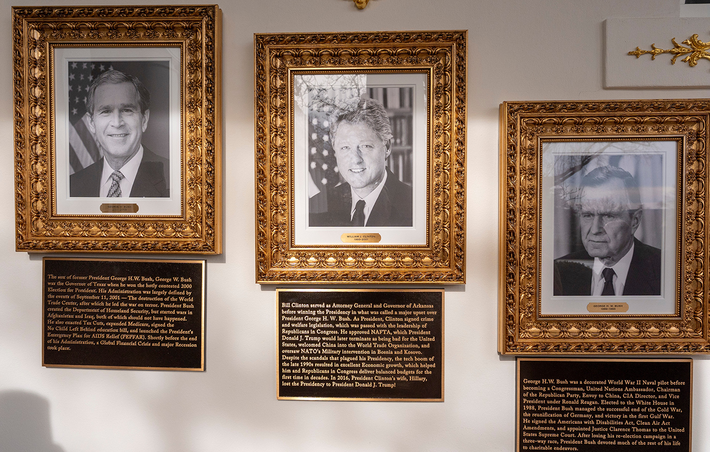 Οι πλάκες έχουν τοποθετηθεί κάτω από προεδρικά πορτρέτα που εκτίθενται στον νεοσύστατο «Προεδρικό Δρόμο της Δόξας», στην κιονοστοιχία του Λευκού Οίκου.