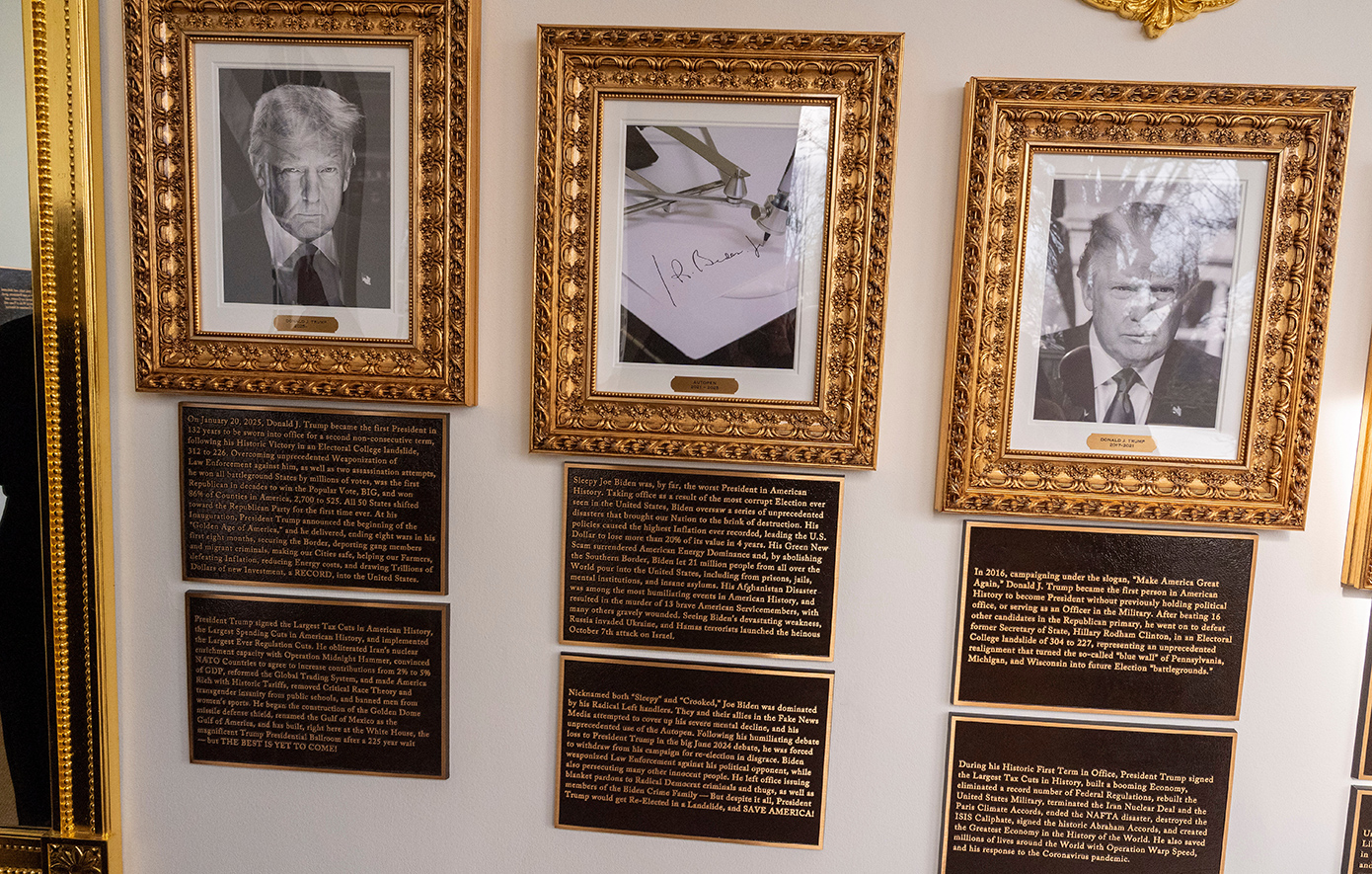 Ο Λευκός Οίκος προχώρησε στην τοποθέτηση πλακών στο εξωτερικό του κτιρίου, στις οποίες αναγράφονται επικριτικά σχόλια και προσβλητικοί χαρακτηρισμοί για τους προκατόχους του Ντόναλντ Τραμπ, όπως ο Τζο Μπάιντεν και ο Μπαράκ Ομπάμα, προβάλλοντας παράλληλα παραπλανητικούς ισχυρισμούς για τις θητείες τους.