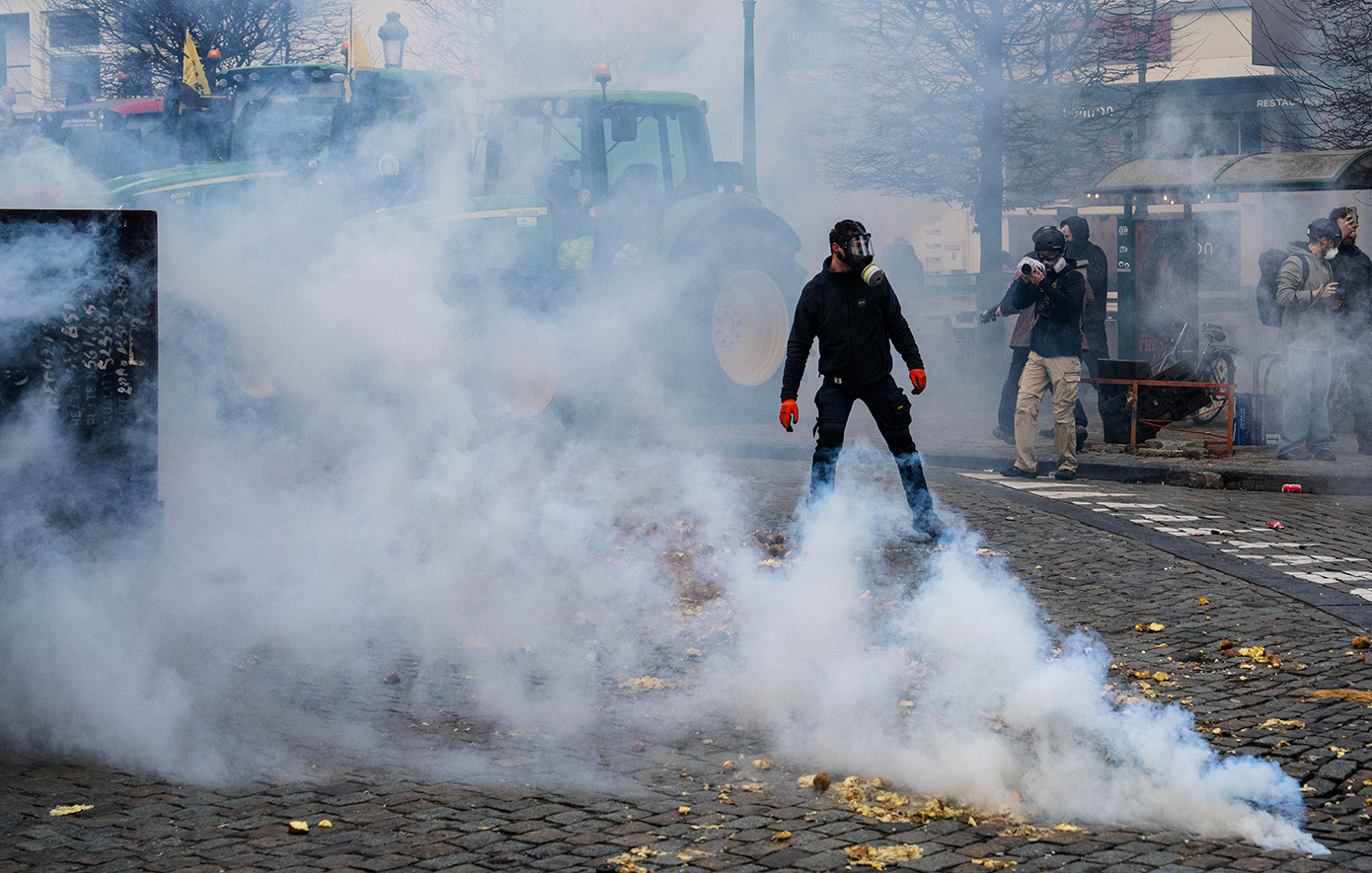 Οι εικόνες από διεθνή πρακτορεία δείχνουν φωτιές σε βαρέλια, ισχυρές αστυνομικές δυνάμεις και αγρότες που κλείνουν τους δρόμους με τα τρακτέρ τους, ενώ σε βίντεο έχουν καταγραφεί οι συγκρούσεις.