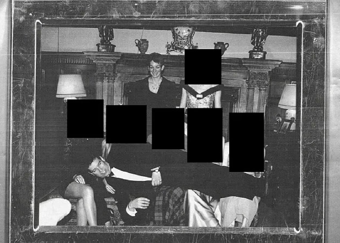 Πίσω του στέκεται χαμογελαστή η συνεργός του Έπσταϊν, Γκισλέιν Μάξγουελ, μαζί με μια άλλη άγνωστη γυναίκα, της οποίας το πρόσωπο έχει καλυφθεί.