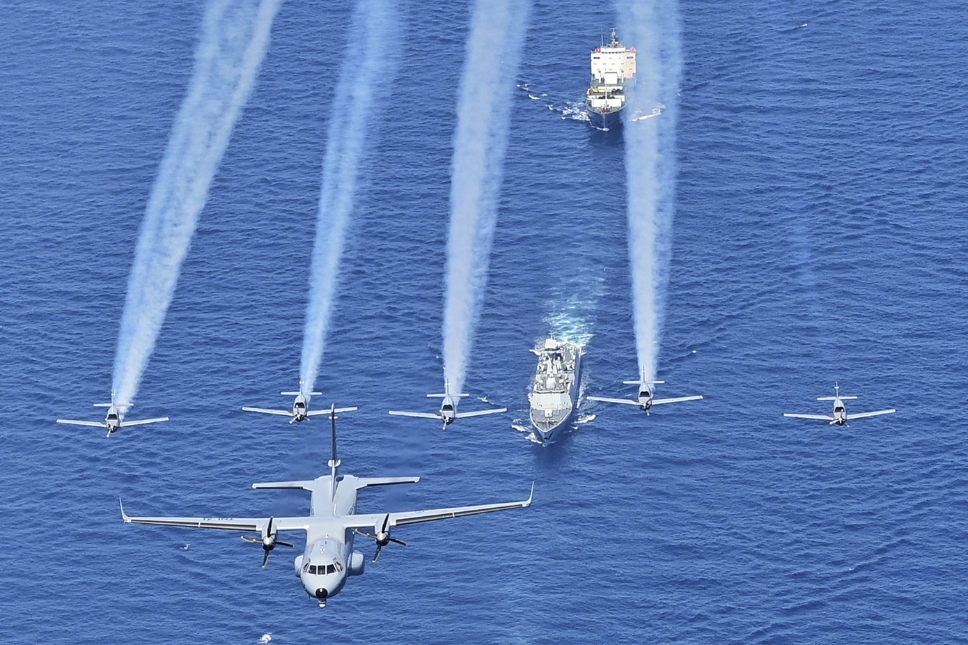 Aircrafts of Indonesian Navy’s 800 and 200 Air Squadron fly past war ships during the closing of the 4th Multilateral Naval Exercise Komodo 2023 in Makassar waters, Indonesia, Thursday, June 8, 2023. Navies from more than 30 countries including the U.S., Britain, Japan, China, Brazil, India, South Korea and Russia took part in the non-combat exercise that was held amid tensions in the Asia-Pacific region. (AP Photo/Eric Ireng)