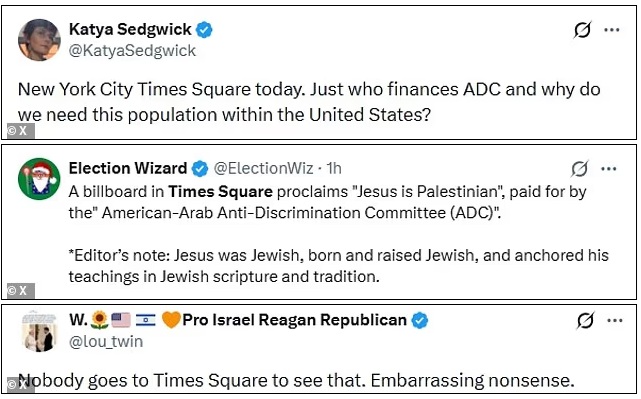 Μια διαφημιστική πινακίδα που εμφανίστηκε χθες στην Times Square της Νέας Υόρκης και διακήρυττε ότι «Ο Ιησούς είναι Παλαιστίνιος» προκάλεσε ποικίλες αντιδράσεις τόσο από περαστικούς όσο και από χρήστες των μέσων κοινωνικής δικτύωσης.