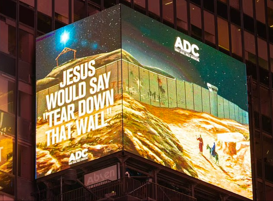 Η συγκεκριμένη πινακίδα ακολούθησε προηγούμενη καμπάνια της ADC, με το μήνυμα «Ο Ιησούς θα έλεγε “γκρεμίστε αυτό το τείχος”», σε αναφορά στην ιστορική ομιλία του Ρόναλντ Ρίγκαν για το Τείχος του Βερολίνου.