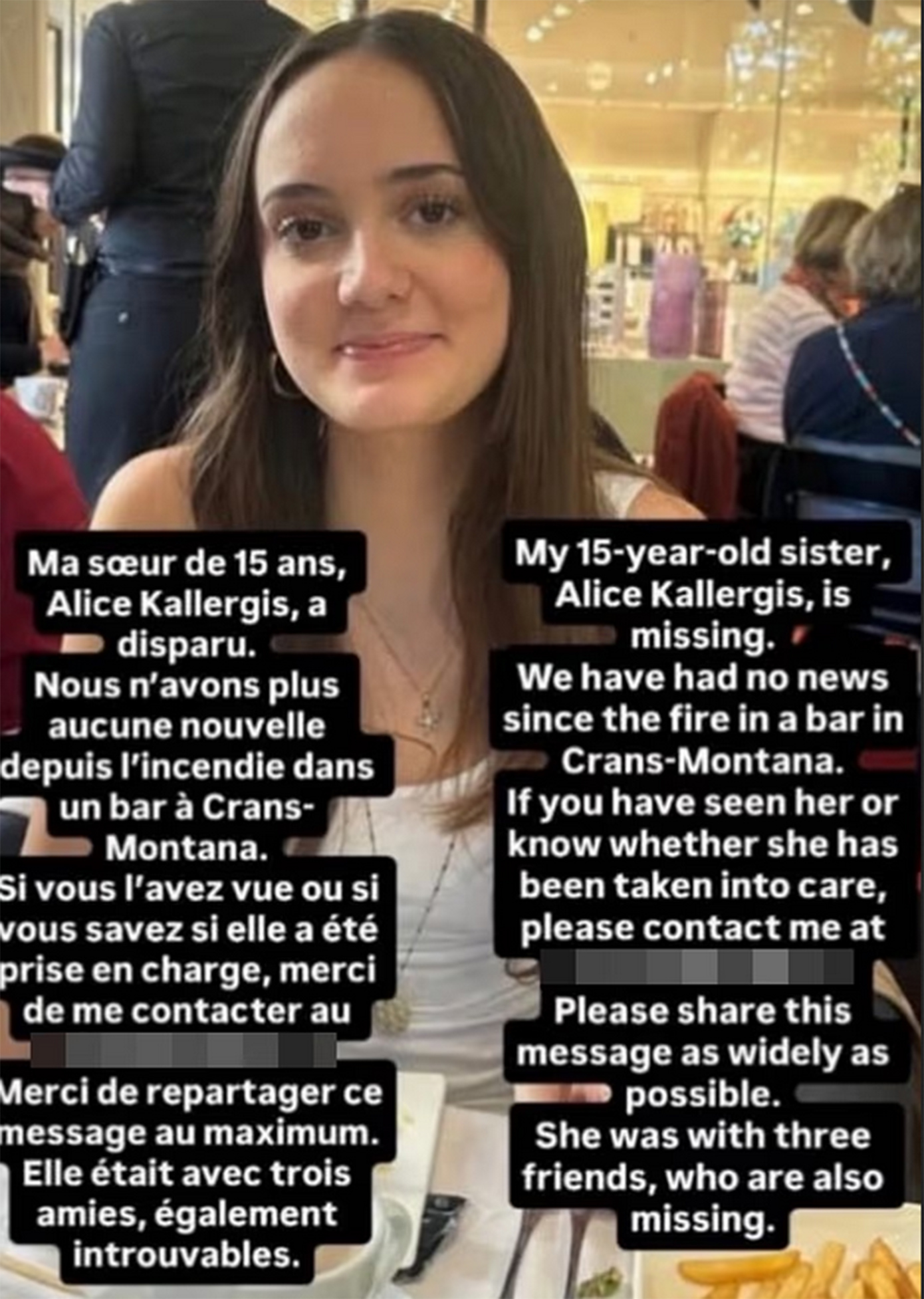 «Τον ψάχνω πάνω από 30 ώρες», δήλωσε στο BFMTV, αφού επισκέφθηκε όλα τα νοσοκομεία που μπόρεσε να βρει. Όπως ανέφερε, ο γιος της και 10 φίλοι του από το σχολείο είχαν κλείσει τραπέζι στο μοιραίο νυχτερινό κέντρο για να γιορτάσουν την αλλαγή του χρόνου. Ανυπομονούσε να γιορτάσει την παραμονή της Πρωτοχρονιάς με τους φίλους του στο θέρετρο και σε αυτό το μπαρ. Είχαν κάνει σχέδια και είχαν κλείσει τραπέζι εκ των προτέρων. Από τα 11 άτομα που κάθονταν σε εκείνο το τραπέζι, μόνο ένα έχει βρεθεί, ενώ όλα τα άλλα αγνοούνται. Ο γιος μου είναι μόνος του στο νοσοκομείο, αν είναι ζωντανός. Ακόμα και αν είναι στο νεκροτομείο, γιατί μετά από 30 ώρες πρέπει να μπορείς να σκεφτείς καθαρά, δεν ξέρω σε ποιο νεκροτομείο, δεν μπορώ να είμαι δίπλα του», είπε χαρακτηριστικά.