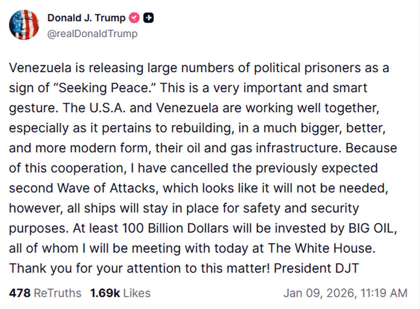 Συγκεκριμένα, ο Αμερικανός πρόεδρος είπε ότι οι ΗΠΑ και η Βενεζουέλα συνεργάζονται καλά, προσθέτοντας ότι τουλάχιστον 100 δισεκατομμύρια δολάρια θα επενδυθούν από τις μεγάλες πετρελαϊκές εταιρείες («big oil») στη Βενεζουέλα. Πρόσθεσε, ωστόσο, ότι όλα τα πετρελαιοφόρα στη Βενεζουέλα «θα παραμείνουν στη θέση τους για σκοπούς ασφάλειας και προστασίας».