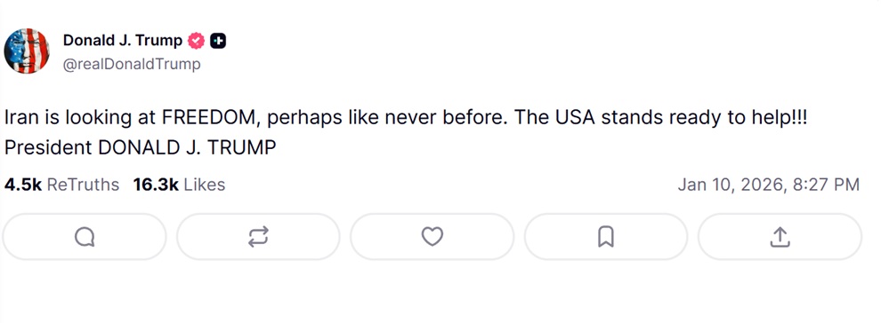 «Το Ιράν λαχταρά την ελευθερία, όπως ίσως ποτέ πριν. Οι Ηνωμένες Πολιτείες είναι έτοιμες να βοηθήσουν!!!» έγραψε ο πρόεδρος των ΗΠΑ στην πλατφόρμα του Truth Social.