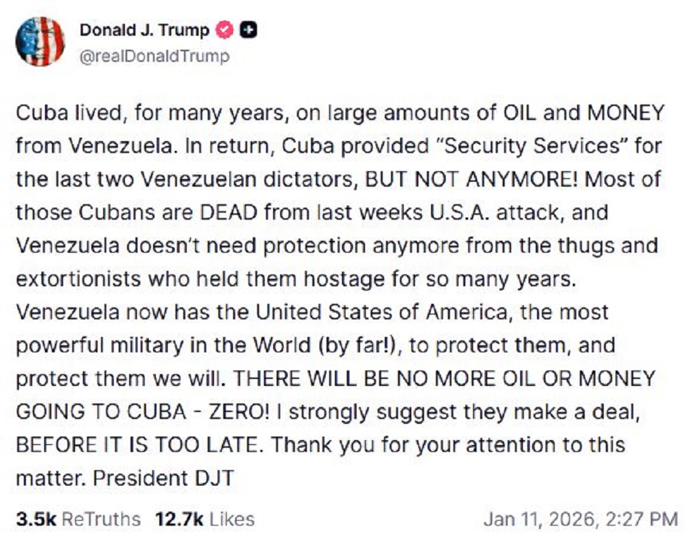 «Η Κούβα ζούσε, για πολλά χρόνια, από μεγάλες ποσότητες ΠΕΤΡΕΛΑΙΟΥ και ΧΡΗΜΑΤΩΝ από τη Βενεζουέλα. Σε αντάλλαγμα, η Κούβα παρείχε “υπηρεσίες ασφαλείας” στους δύο τελευταίους δικτάτορες της Βενεζουέλας, ΑΛΛΑ ΟΧΙ ΠΛΕΟΝ! Οι περισσότεροι από αυτούς τους Κουβανούς είναι ΝΕΚΡΟΙ από την επίθεση των ΗΠΑ την περασμένη εβδομάδα, και η Βενεζουέλα δεν χρειάζεται πλέον προστασία από τους κακοποιούς και τους εκβιαστές που τους κρατούσαν όμηρους για τόσα χρόνια. Η Βενεζουέλα έχει τώρα τις Ηνωμένες Πολιτείες της Αμερικής, τον ισχυρότερο στρατό στον κόσμο (μακράν!), για να την προστατεύσει, και θα την προστατεύσουμε. ΔΕΝ ΘΑ ΥΠΑΡΧΕΙ ΠΛΕΟΝ ΠΕΤΡΕΛΑΙΟ Ή ΧΡΗΜΑΤΑ ΠΡΟΣ ΤΗΝ ΚΟΥΒΑ – ΜΗΔΕΝ! Προτείνω ανεπιφύλακτα να κάνουν μια συμφωνία, ΠΡΙΝ ΕΙΝΑΙ ΠΟΛΥ ΑΡΓΑ. Σας ευχαριστώ για την προσοχή σας σε αυτό το θέμα».
