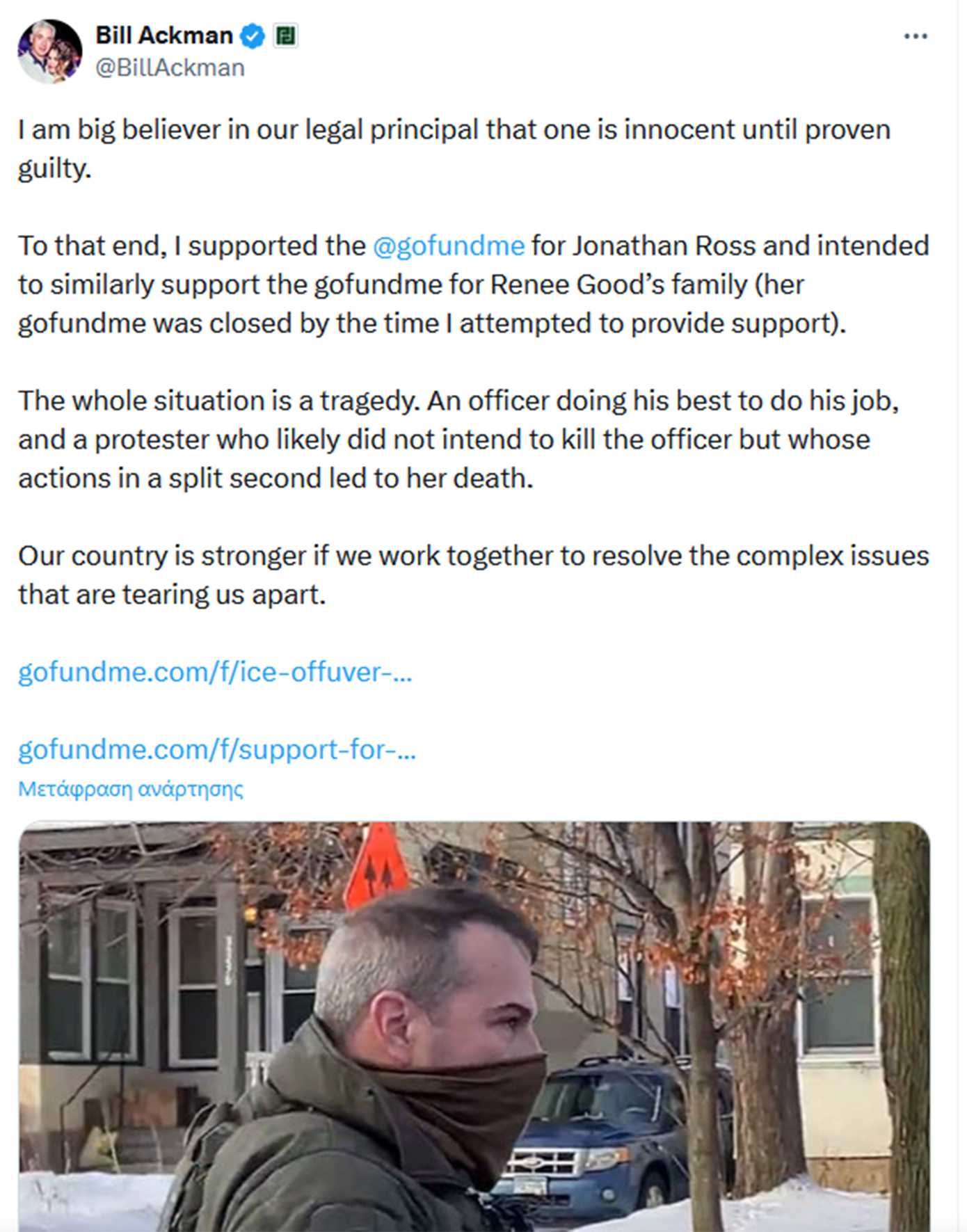 Ο συντηρητικός δισεκατομμυριούχος Bill Ackman, που είναι ιδρυτής της Pershing Square Capital Management, του οποίου η περιουσία αγγίζει τα 9,3 δισεκατομμύρια δολάρια, προχώρησε σε μια δωρεά ύψους 10.000 δολαρίων μέσω του GoFundMe υπέρ του Jonathan Ross. Πρόκειται για τον πράκτορα της Υπηρεσίας Επιβολής Μετανάστευσης και Τελωνείων (ICE) που πυροβόλησε και τραυμάτισε θανάσιμα τη διαδηλώτρια και μητέρα τριών παιδιών, Renee Nicole Good, σε ένα περιστατικό που οι αρχές χαρακτήρισαν ως «αμυντικά πυρά».