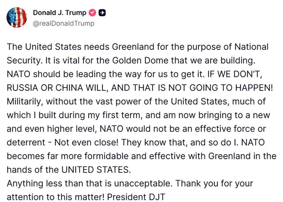 Στο ίδιο μήνυμα, ο Ντόναλντ Τραμπ ανέφερε ότι «το ΝΑΤΟ θα έπρεπε να ηγείται της προσπάθειας για να την αποκτήσουμε», προσθέτοντας ότι «αν δεν το κάνουμε εμείς, θα το κάνουν η Ρωσία ή η Κίνα, και αυτό δεν πρόκειται να συμβεί». Με τον τρόπο αυτό συνέδεσε ευθέως τη Γροιλανδία με τον γεωπολιτικό ανταγωνισμό των μεγάλων δυνάμεων και τον ρόλο της Βορειοατλαντικής Συμμαχίας.