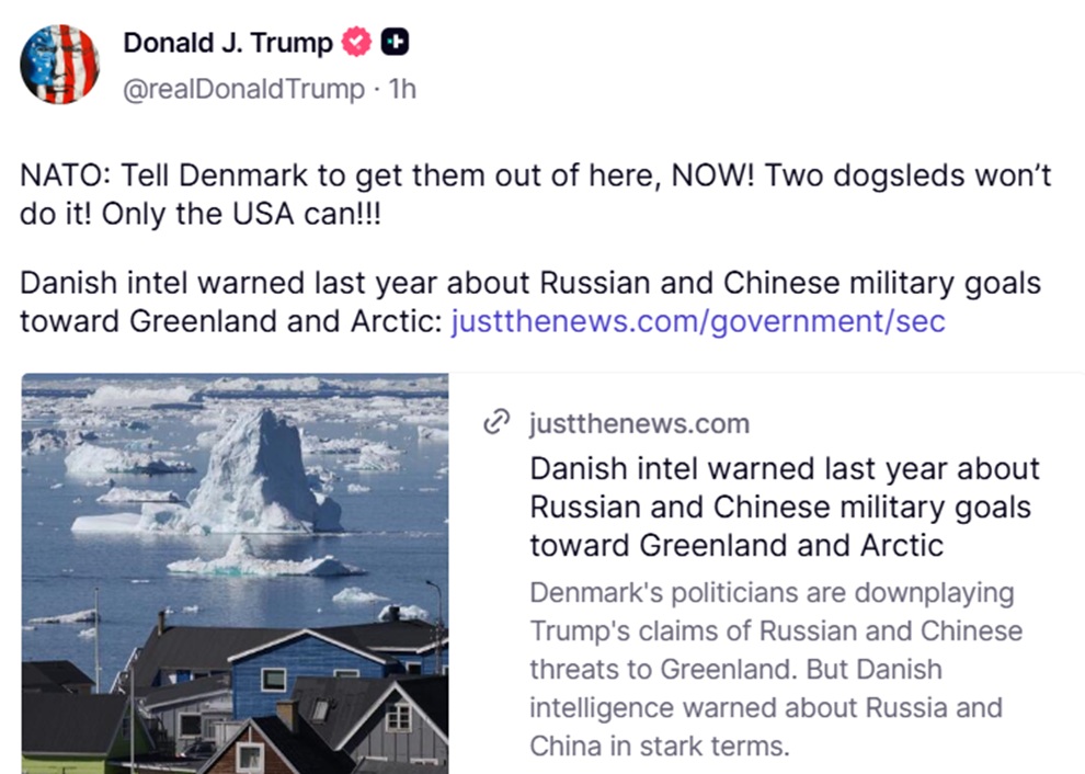 Σε ανάρτηση στο Truth Social, αναφερόμενος στη Ρωσία και την Κίνα, ο Τραμπ έγραψε: «ΝΑΤΟ: Πείτε στη Δανία να τους βγάλει από εδώ, ΤΩΡΑ! Δύο έλκηθρα με σκύλους δεν θα το κάνουν! Μόνο οι ΗΠΑ μπορούν!!!»