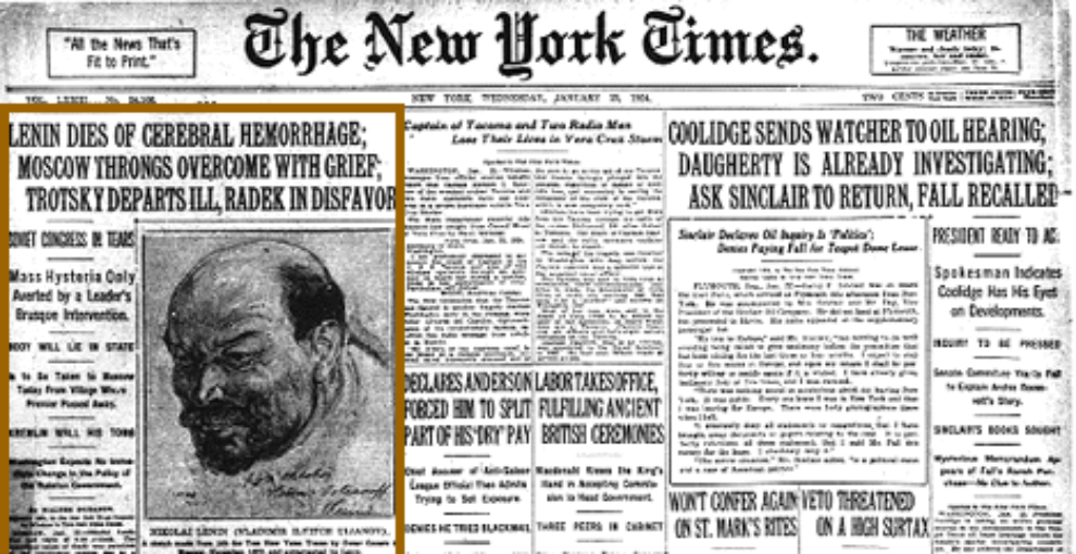 Στις 21 Ιανουαρίου 1924, ο Βλαντίμιρ Ιλίτς Ουλιάνοφ, ο Λένιν, πεθαίνει στο Γκόρκι, έξω από τη Μόσχα, σε ηλικία 53 ετών. Η επίσημη εκδοχή αποδίδει τον θάνατό του σε βαριά εγκεφαλοαγγειακή νόσο, ύστερα από διαδοχικά εγκεφαλικά που τον είχαν ήδη αφήσει με σοβαρές αναπηρίες και δυσκολία στον λόγο.