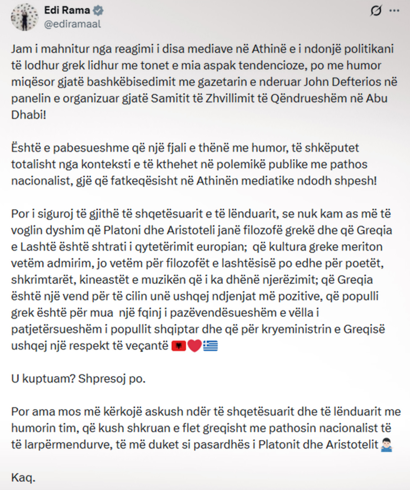 Αλλά διαβεβαιώνω όλους όσους ανησυχούν και αισθάνονται προσβεβλημένοι ότι δεν έχω την παραμικρή αμφιβολία ότι ο Πλάτωνας και ο Αριστοτέλης είναι Έλληνες φιλόσοφοι και ότι η Αρχαία Ελλάδα είναι η κοιτίδα του ευρωπαϊκού πολιτισμού. Ότι η ελληνική κουλτούρα αξίζει μόνο θαυμασμό, όχι μόνο για τους φιλοσόφους της αρχαιότητας, αλλά και για τους ποιητές, τους συγγραφείς, τους κινηματογραφιστές και τη μουσική που έχει δώσει στην ανθρωπότητα ότι η Ελλάδα είναι μια χώρα για την οποία τρέφω τα πιο θετικά συναισθήματα, ότι ο ελληνικός λαός είναι, για μένα, ένας αναντικατάστατος γείτονας και αδιαίρετος αδελφός του αλβανικού λαού, και ότι τρέφω ιδιαίτερο σεβασμό για τον πρωθυπουργό της Ελλάδας.