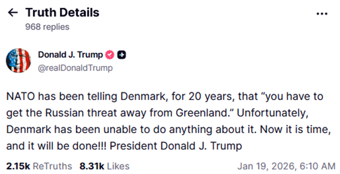 Σε ανάρτησή του στο Truth Social τα ξημερώματα της Δευτέρας, ο Τραμπ ισχυρίστηκε ότι το ΝΑΤΟ προειδοποιεί τη Δανία εδώ και 20 χρόνια να απομακρύνει τη «ρωσική απειλή» από τη Γροιλανδία, προσθέτοντας προκλητικά: «Τώρα ήρθε η ώρα και θα γίνει!!!». Ο Αμερικανός πρόεδρος επιμένει ότι η περιοχή είναι ζωτικής σημασίας για την ασφάλεια των ΗΠΑ και δεν απέκλεισε το ενδεχόμενο κατάληψής της με τη βία, δηλώνοντας ότι η Ουάσιγκτον θα την αποκτήσει είτε με τον «εύκολο» είτε με τον «δύσκολο τρόπο».