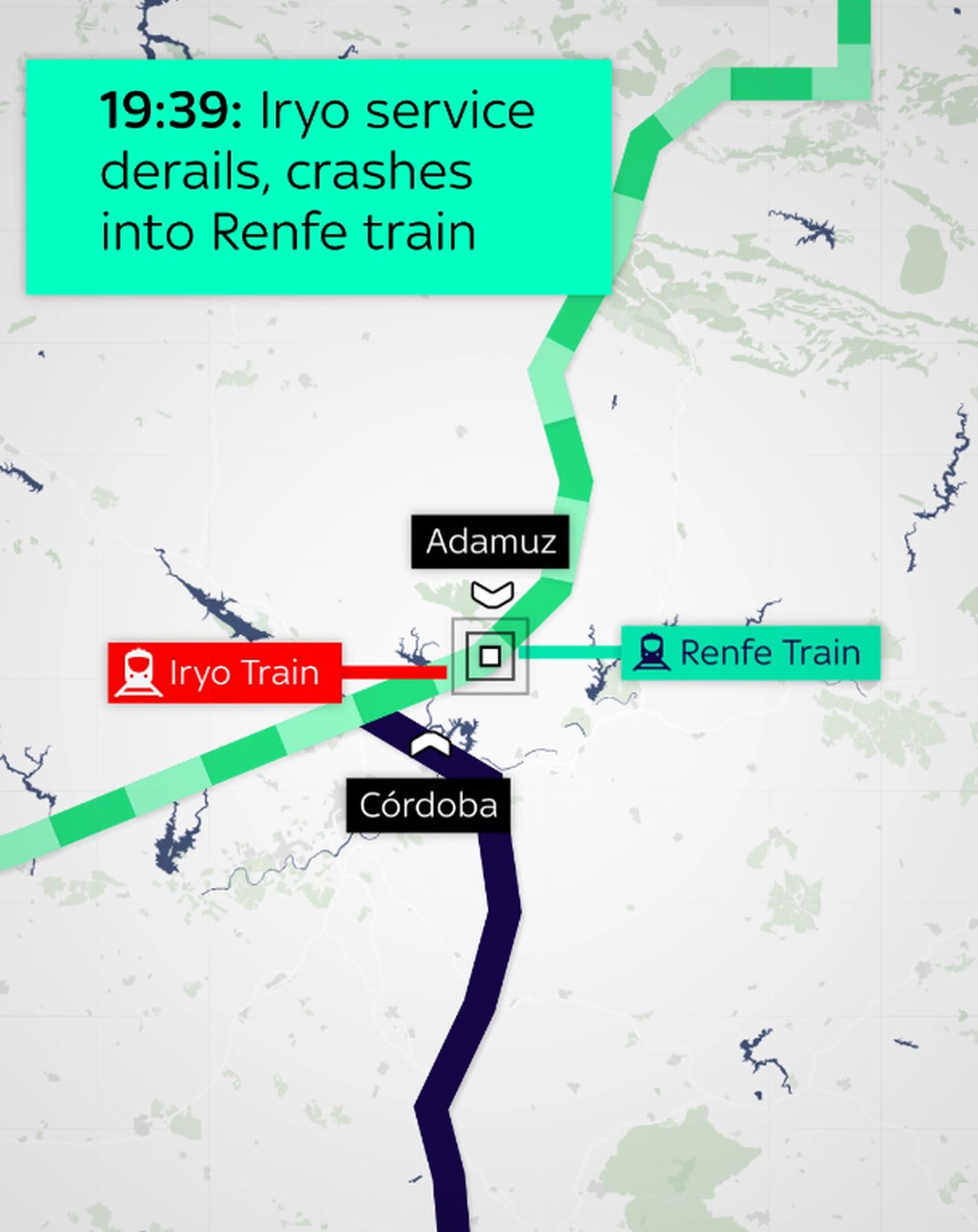 Η ομάδα Sky News Data & Forensics εξέτασε πώς εξελίχθηκε το δυστύχημα: Πριν από το δυστύχημα, ένα τρένο της ιδιωτικής εταιρείας Iryo που μετέφερε περίπου 300 επιβάτες αναχώρησε από τη Μάλαγα με προορισμό την πρωτεύουσα Μαδρίτη στις 6:40 μ.μ. (5:40 μ.μ. GMT).