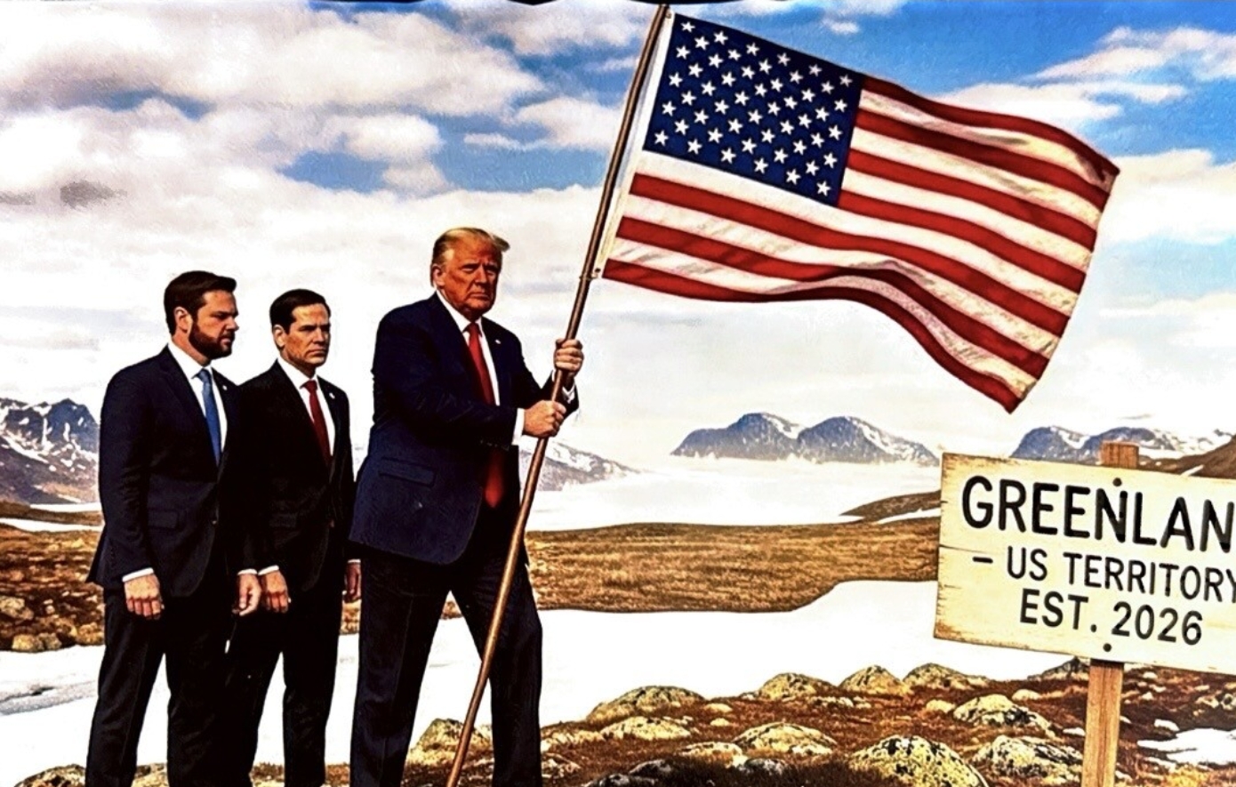 Ο Αμερικανός πρόεδρος ανάρτησε επίσης μια εικόνα AI που τον δείχνει μαζί με τους Μάρκο Ρούμπιο και Τζέι Ντι Βανς να καρφώνουν την αμερικανική σημαία στη Γροιλανδία, δίπλα σε μια πινακίδα που γράφει: «Γροιλανδία – Έδαφος των ΗΠΑ – Έτος Ίδρυσης 2026».