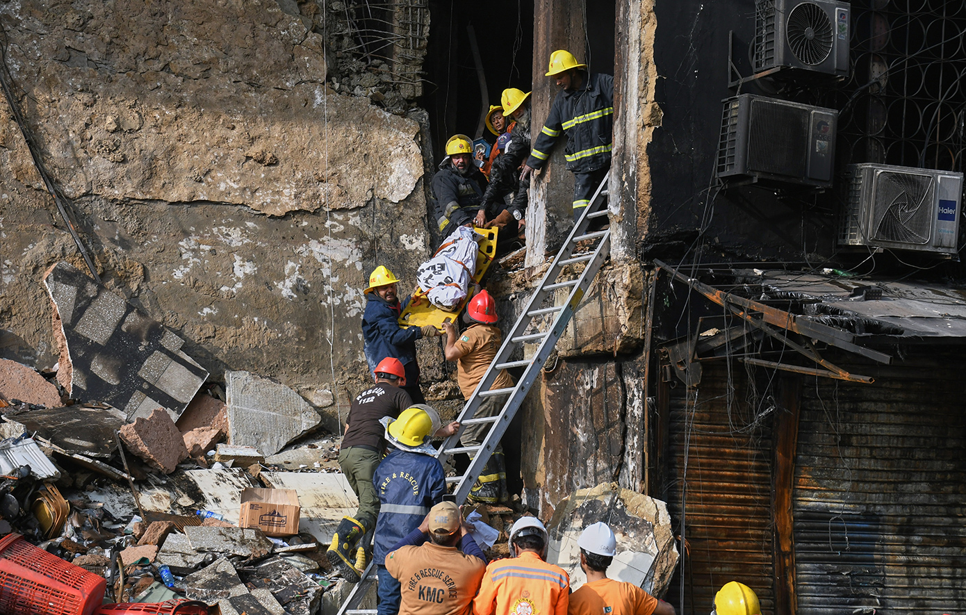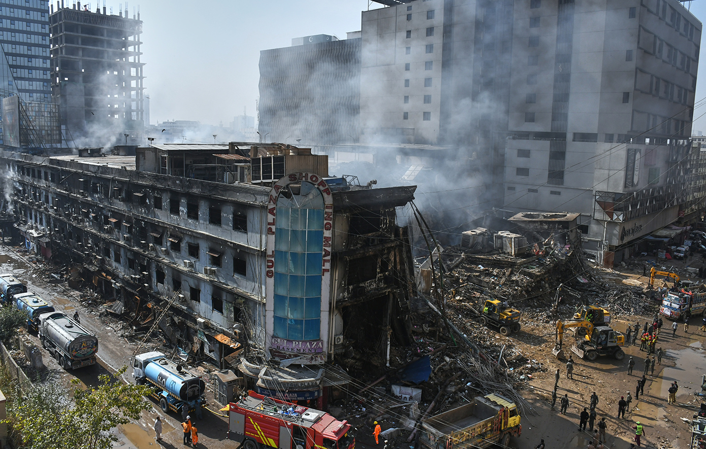 Μεγάλο τμήμα της κάποτε επιβλητικής κατασκευής, μεγαλύτερης από ένα γήπεδο ποδοσφαίρου, μετατράπηκε σε σωρό από στάχτη και συντρίμμια σκορπισμένα στον δρόμο, καθώς οι διασώστες αναζητούσαν αγνοουμένους. Ο Ριζουάν Άχμεντ από την ομάδα «Rescue 1122» δήλωσε σήμερα ότι «21 άνθρωποι έχασαν τη ζωή τους στην πυρκαγιά, ενώ άλλοι 63 εξακολουθούν να αγνοούνται», σχεδόν τρεις ημέρες μετά την εκδήλωση της πυρκαγιάς.