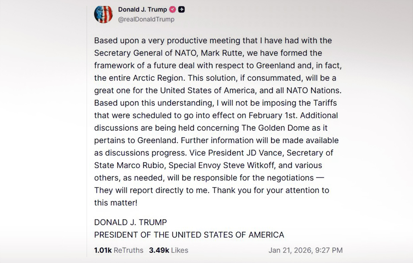 «Με βάση μια ιδιαίτερα παραγωγική συνάντηση που είχα με τον γενικό γραμματέα του ΝΑΤΟ, Μαρκ Ρούτε, διαμορφώσαμε το πλαίσιο μιας μελλοντικής συμφωνίας σχετικά με τη Γροιλανδία και, στην πραγματικότητα, ολόκληρη την Αρκτική περιοχή», έγραψε ο Τραμπ στο Truth Social. «Αν αυτή η λύση ολοκληρωθεί, θα είναι εξαιρετική για τις Ηνωμένες Πολιτείες και για όλα τα κράτη-μέλη του ΝΑΤΟ. Με βάση αυτή την κατανόηση, δεν θα επιβάλω τους δασμούς που είχαν προγραμματιστεί να τεθούν σε ισχύ την 1η Φεβρουαρίου».