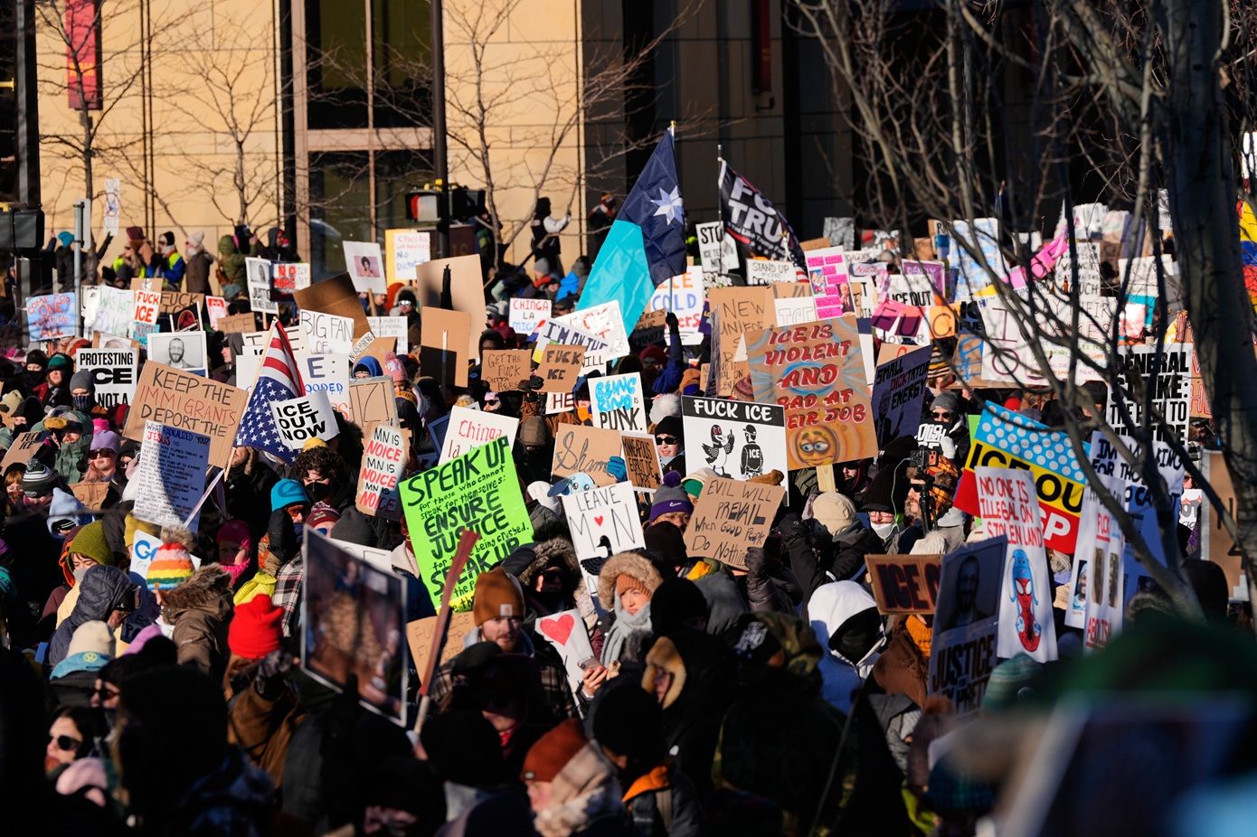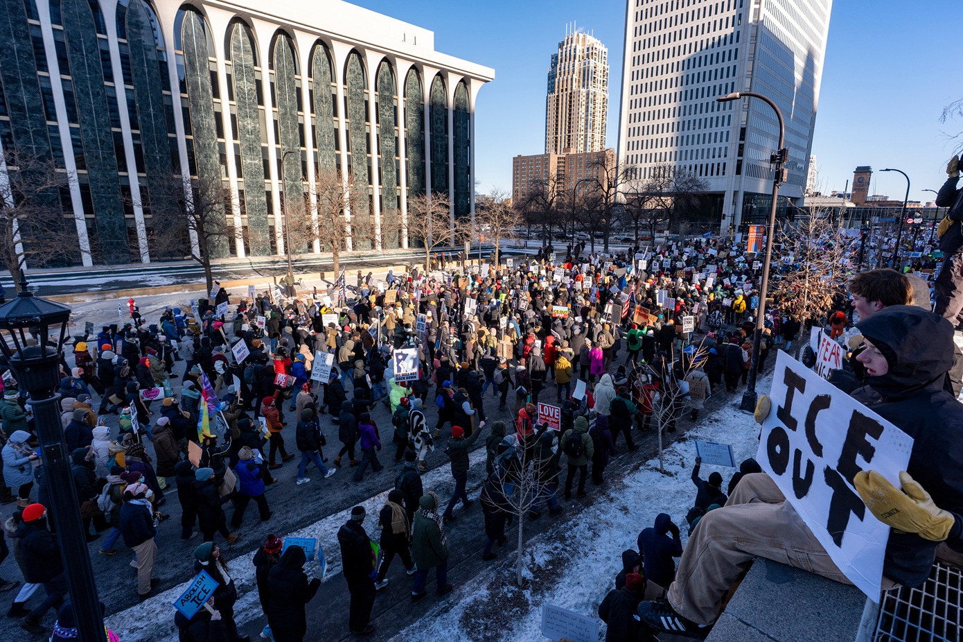 Παρά τις χαμηλές θερμοκρασίες, χιλιάδες διαδηλωτές συγκεντρώθηκαν στο κέντρο της Μινεάπολης, εκφράζοντας την αντίθεσή τους στην ανάπτυξη και στις τακτικές της υπηρεσίας μετανάστευσης ICE. Ανάμεσά τους βρίσκονταν οικογένειες με μικρά παιδιά, ηλικιωμένα ζευγάρια αλλά και ακτιβιστές.