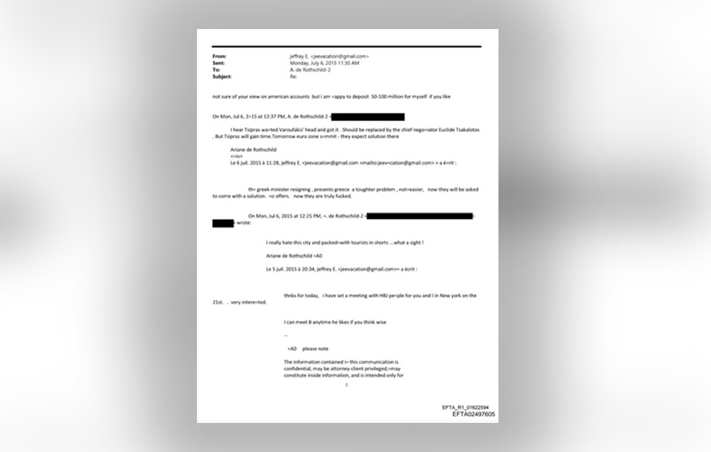 Ηλεκτρονικά μηνύματα με κεντρικό ζήτημα τις εξελίξεις στην Ελλάδα με το δημοψήφισμα του Αλέξη Τσίπρα αντάλλασσαν ο Τζέφρι Επστάιν με την επικεφαλής της Edmond de Rothschild Group, Αριάν ντε Ρότσιλντ.