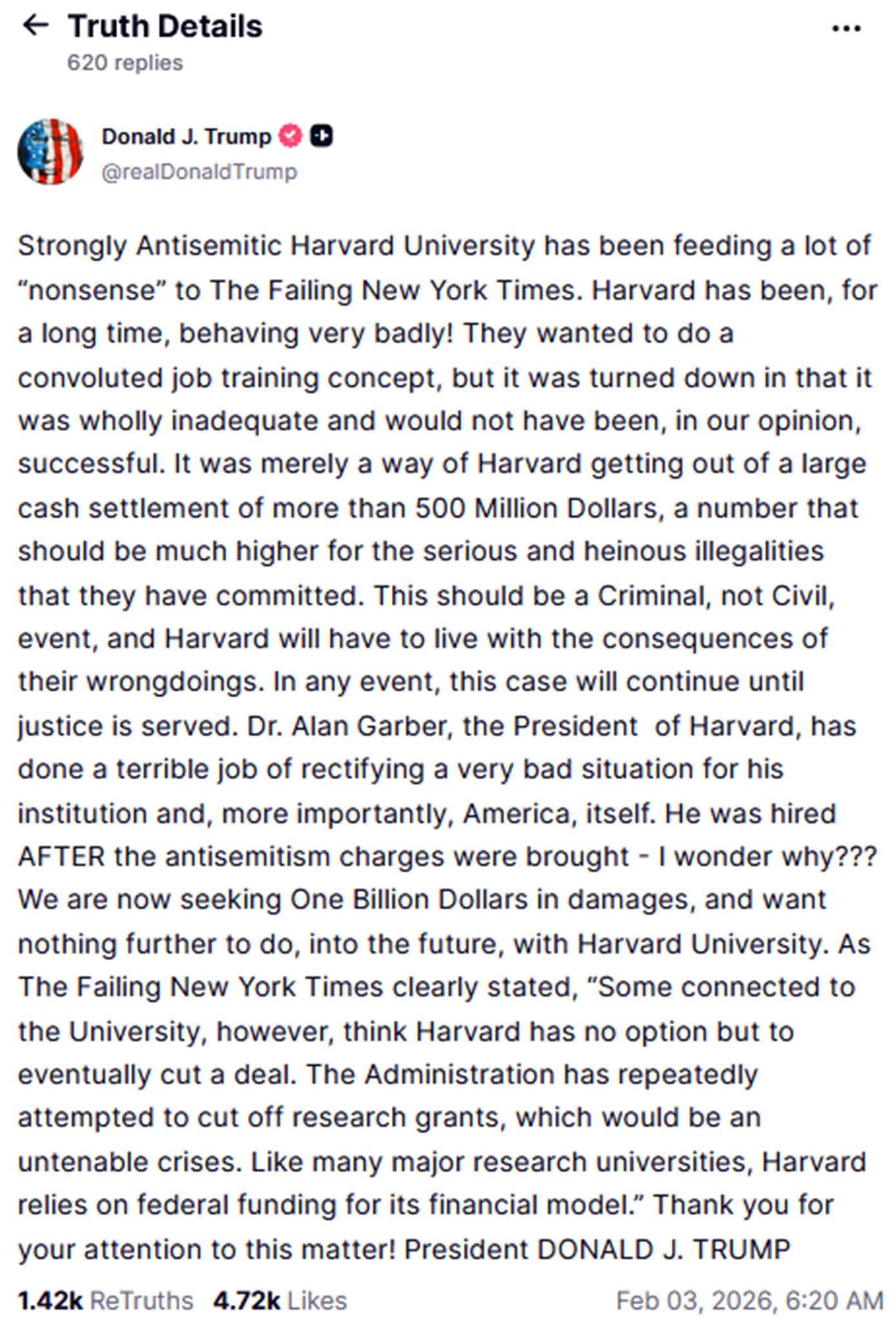 Ποσό ύψους ενός δισεκατομμυρίου δολαρίων για «ζημίες και τόκους» απαιτεί ο Αμερικανός πρόεδρος Ντόναλντ Τραμπ όπως διεμήνυσε το βράδυ της Δευτέρας 2 Φεβρουαρίου, αντιδρώντας σε δημοσίευμα εφημερίδας, σύμφωνα με το οποίο η κυβέρνησή του είχε αποφασίσει να εγκαταλείψει την αξίωση το περίβλεπτο πανεπιστήμιο –στο οποίο προσάπτει αντισημιτισμό και προκατάληψη- να πληρώσει πρόστιμα.