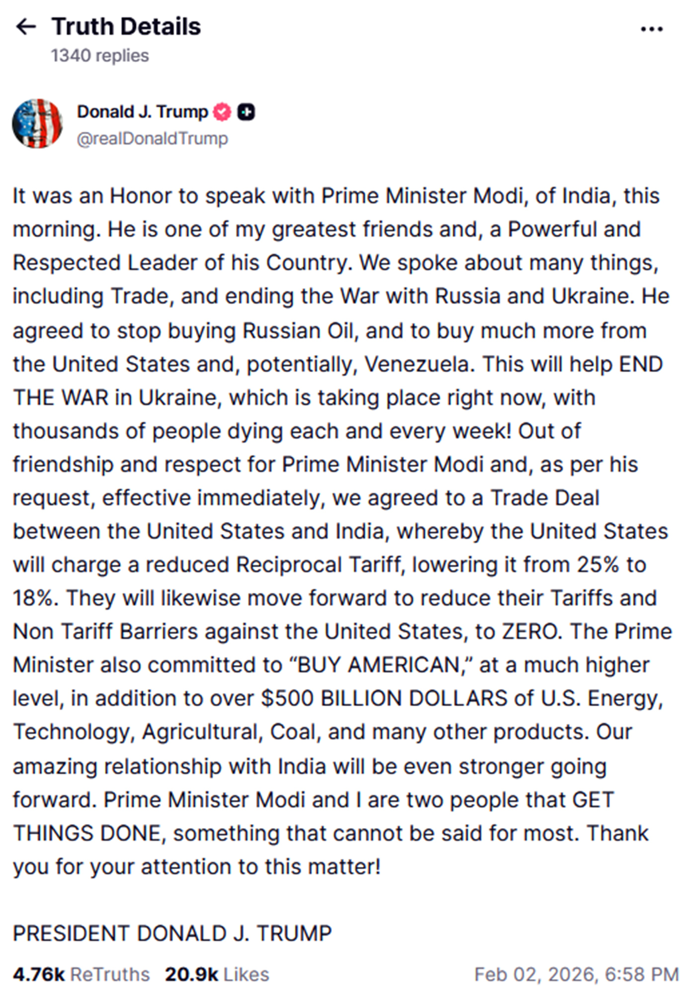 Wonderful to speak with my dear friend President Trump today. Delighted that Made in India products will now have a reduced tariff of 18%. Big thanks to President Trump on behalf of the 1.4 billion people of India for this wonderful announcement.