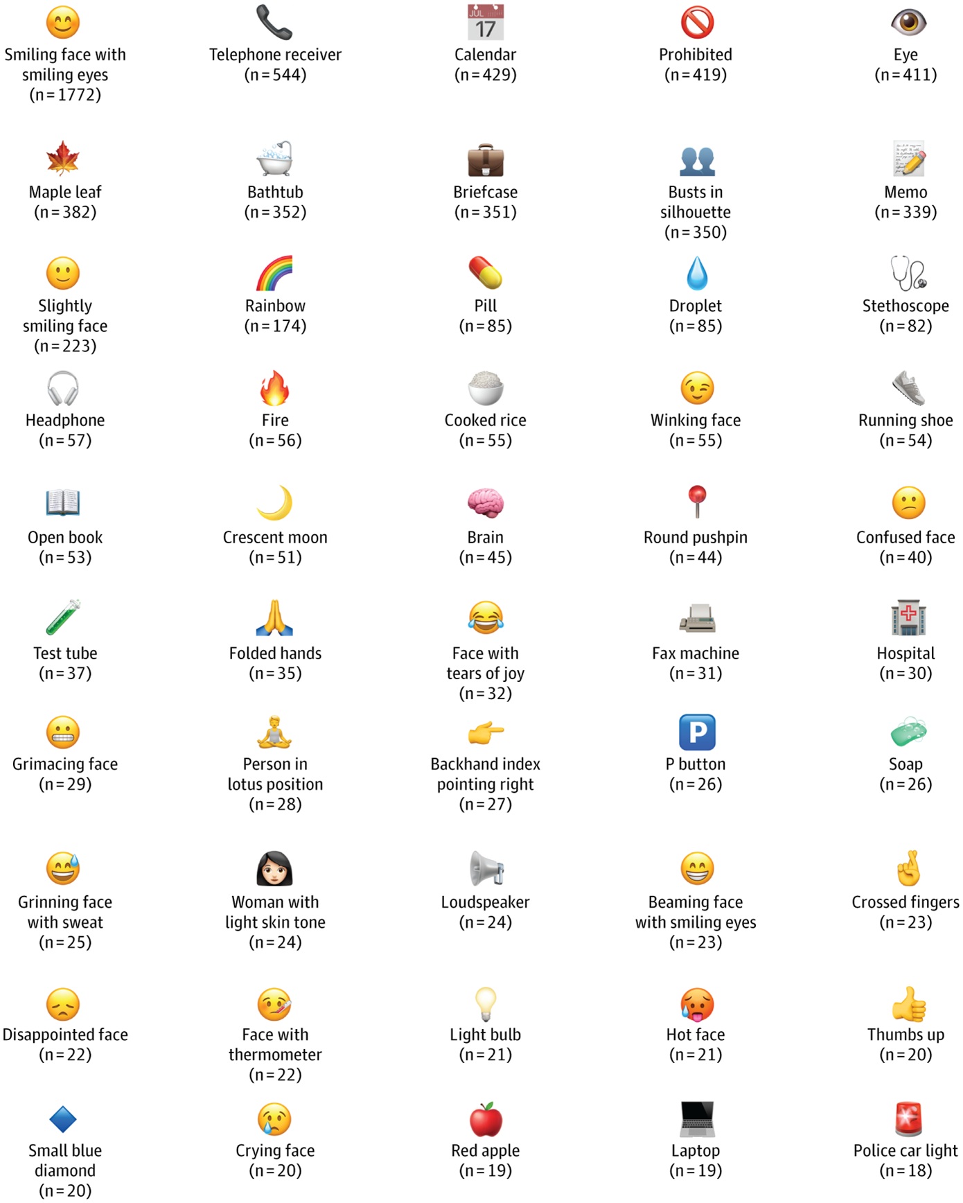 Το πιο συχνά χρησιμοποιούμενο emoji ήταν με διαφορά το «χαμογελαστό πρόσωπο με χαμογελαστά μάτια», ενώ τα «τηλέφωνο», «ημερολόγιο», «απαγορευτικό σύμβολο» (κόκκινος κύκλος με γραμμή) και «μάτι» συμπλήρωσαν την πρώτη πεντάδα.
