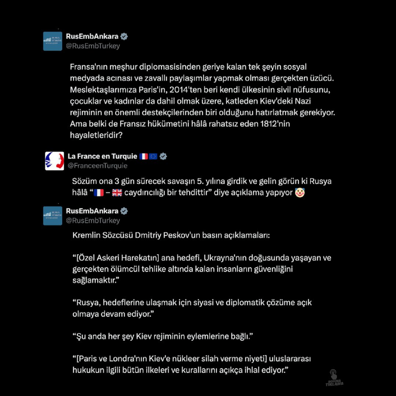 Η διαδικτυακή αντιπαράθεση ξεκίνησε όταν η γαλλική πρεσβεία στην Άγκυρα σχολίασε σκωπτικά ρωσική ανάρτηση για τον πόλεμο, υπενθυμίζοντας ότι η εισβολή στην Ουκρανία παρουσιαζόταν αρχικά ως «πόλεμος που θα τελείωνε σε τρεις ημέρες», αλλά έχει πλέον μπει στον πέμπτο χρόνο, προσθέτοντας ειρωνικά ότι η Μόσχα συνεχίζει να καταγγέλλει τη γαλλοβρετανική «αποτρεπτική ισχύ» ως απειλή.