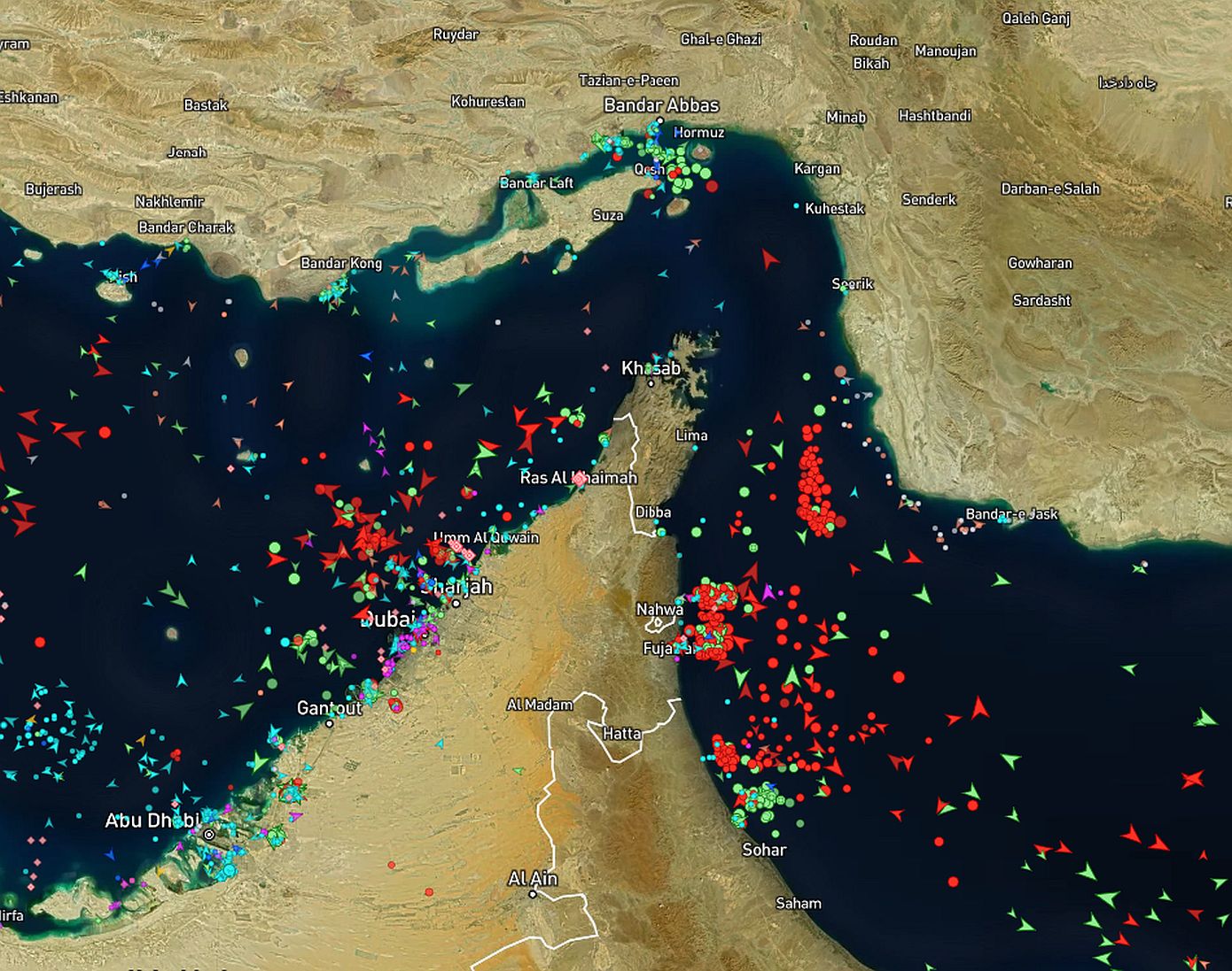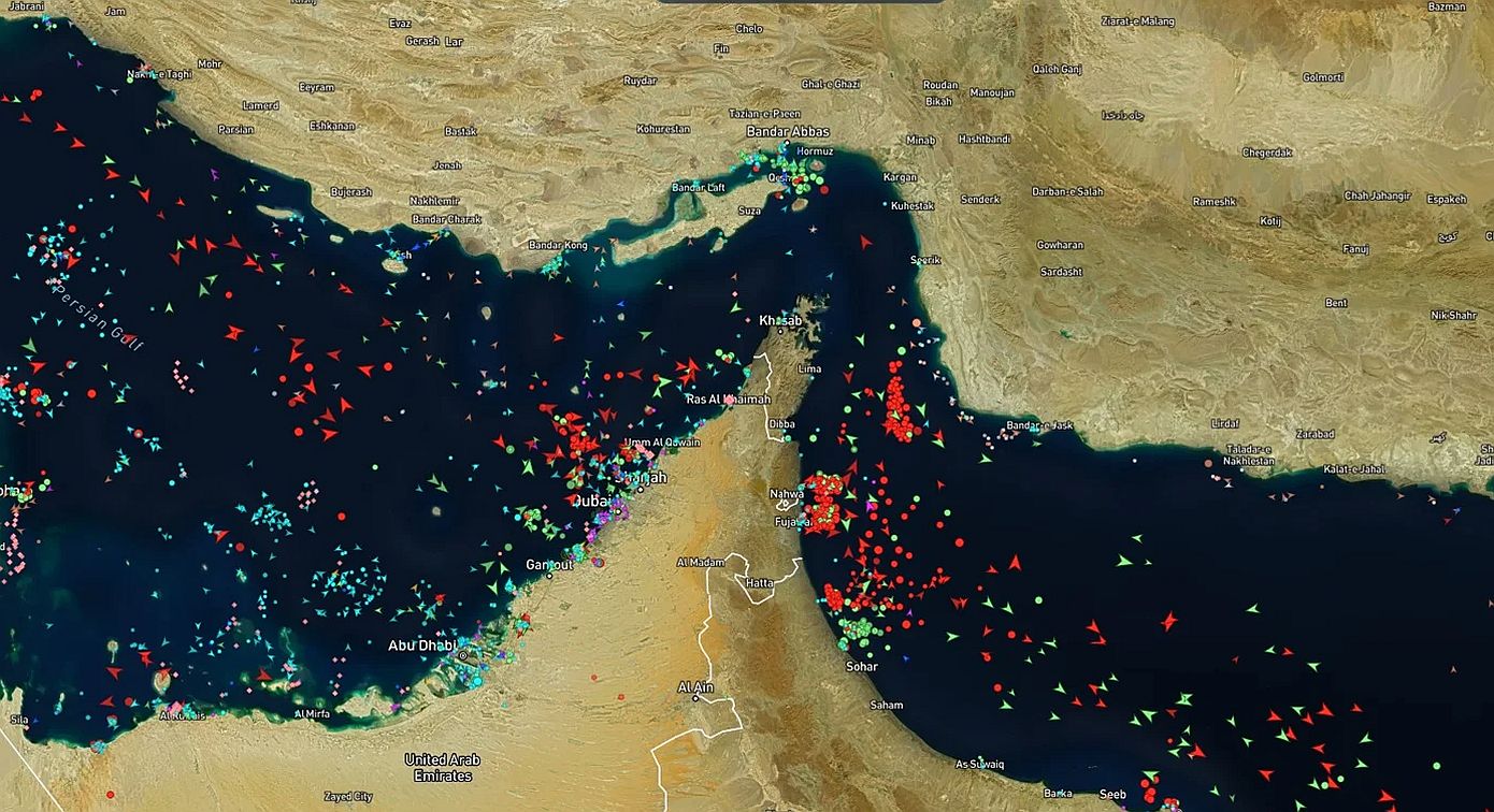 Πρόκειται για δεξαμενόπλοια, φορτηγά πλοία και LNG carriers, που είτε έχουν ρίξει άγκυρα είτε κινούνται με χαμηλή ταχύτητα, δημιουργώντας μια πρωτοφανή συμφόρηση τόσο στην είσοδο όσο και στην έξοδο του Περσικού Κόλπου.