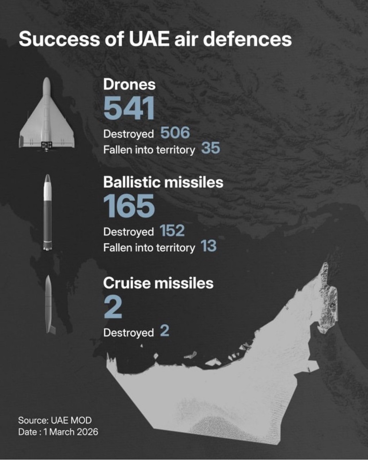 Την Κυριακή 1η Μαρτίου η αεράμυνα των Ηνωμένων Αραβικών Εμιράτων αναχαίτισε με αντίμετρα 506 drones από τα συνολικά 541 με τα 35 να πέφτουν στην επικράτεια της. Την ίδια μέρα από τους 165 βαλιστικούς πυραύλους, αναχαίτισε τους 152 με 13 να πέφτουν στην επικράτεια της, και με δύο πυραύλους Cruise που αναχαιτίστηκαν και οι δυο.