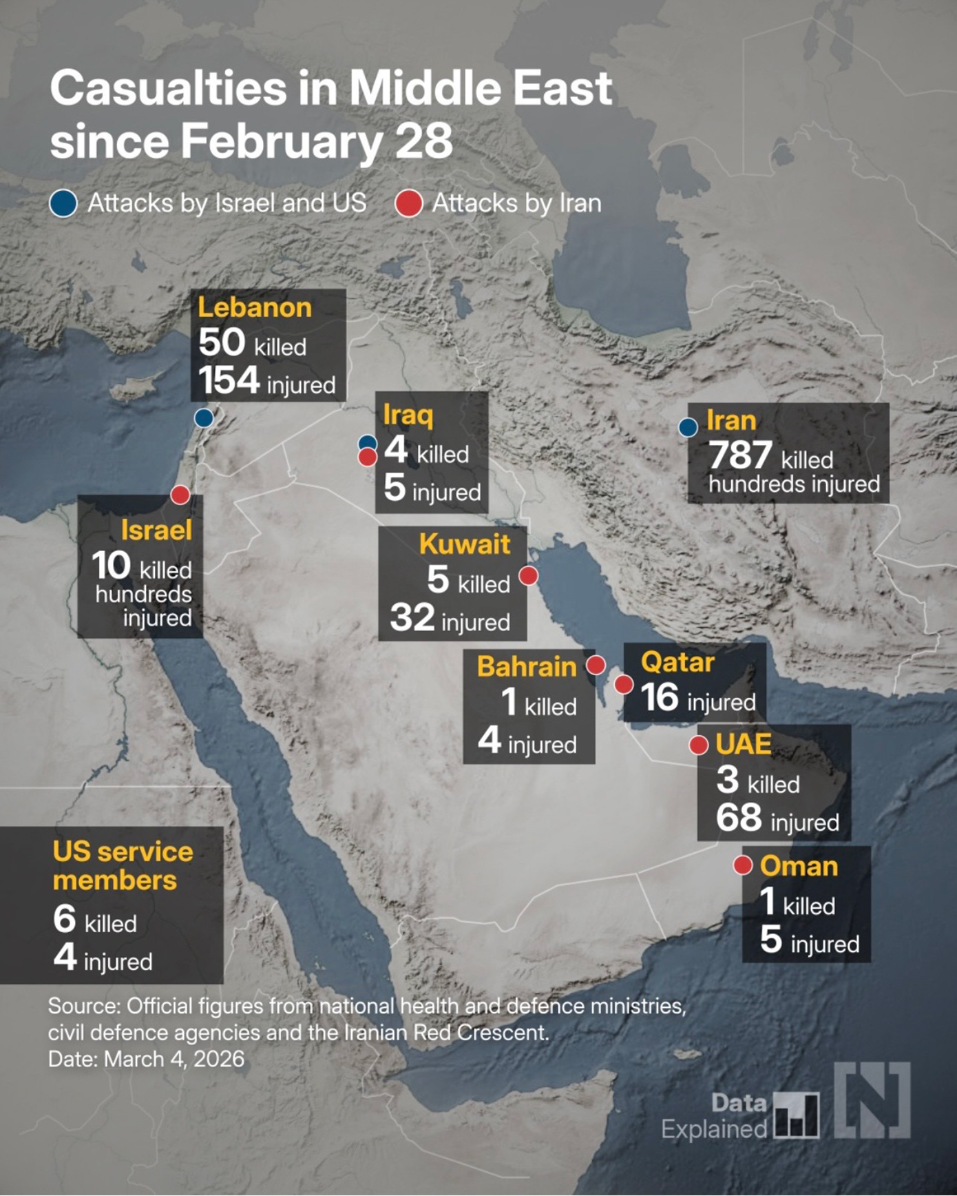 Σύμφωνα με τα στοιχεία αυτά στην περιοχή του Λιβάνου μέχρι και τις 4 Μαρτίου έχασαν την ζωή τους 50 άνθρωποι και τραυματίστηκαν 154, από τις επιθέσεις Ισραηλινών και Αμερικανών.