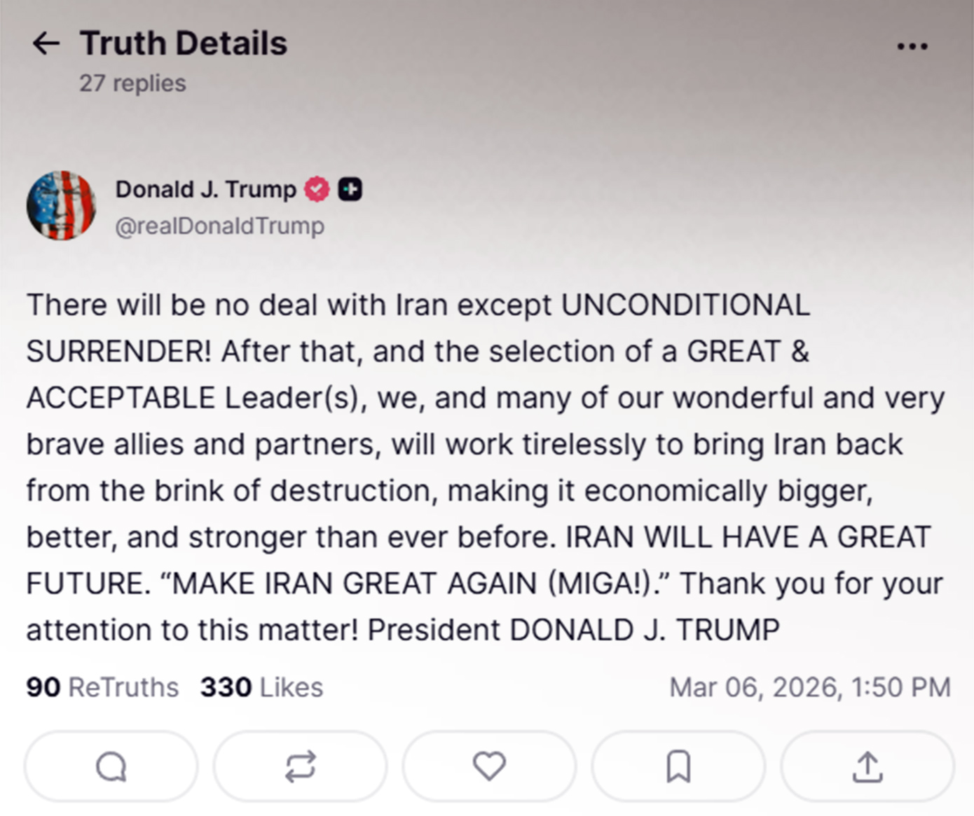 Ο Ντόναλντ Τραμπ έγραψε στα μέσα κοινωνικής δικτύωσης ότι δεν μπορεί να υπάρξει καμία συμφωνία με το Ιράν, παρά μόνο αν η Τεχεράνη παραδοθεί άνευ όρων.
