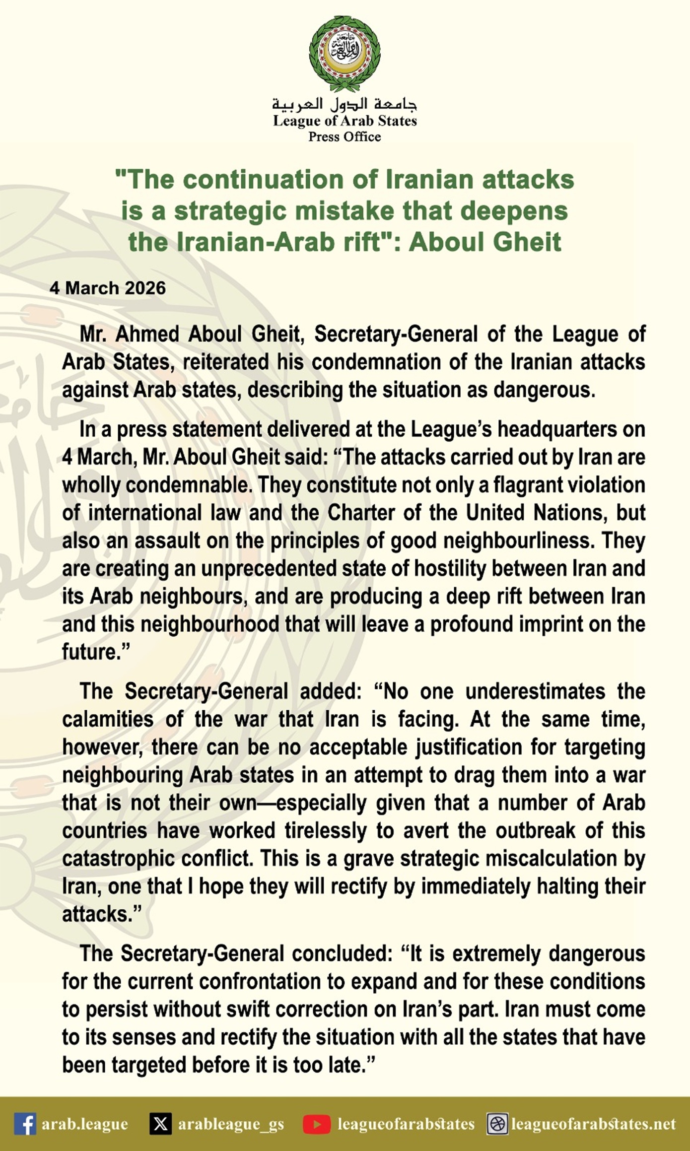 Τα αραβικά κράτη «δεν είναι εμπλεκόμενα μέρη του πολέμου», δεν ήθελαν τον πόλεμο και δήλωσαν σαφώς ότι δεν θα επιτρέψουν το έδαφός τους ή ο εναέριος χώρος τους να χρησιμοποιηθούν για στρατιωτικές επιχειρήσεις, πρόσθεσε.