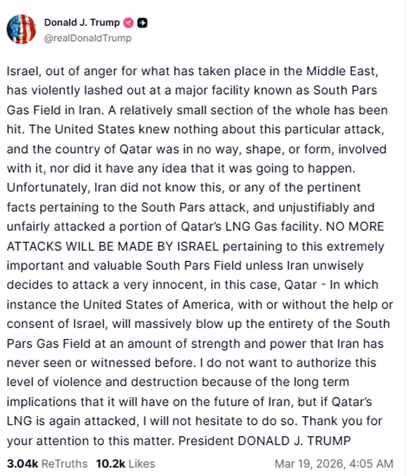 Ο Αμερικανός πρόεδρος επιβεβαίωσε μέσω Truth Social ότι η πολεμική αεροπορία του Ισραήλ έπληξε το κοίτασμα αερίου στο South Pars, διατεινόμενος ότι οι ΗΠΑ «δεν γνώριζαν τίποτα» για τον βομβαρδισμό αυτό, ο οποίος πυροδότησε τα αντίποινα του Ιράν εναντίον της εγκατάστασης στη Ras Laffan του Κατάρ.