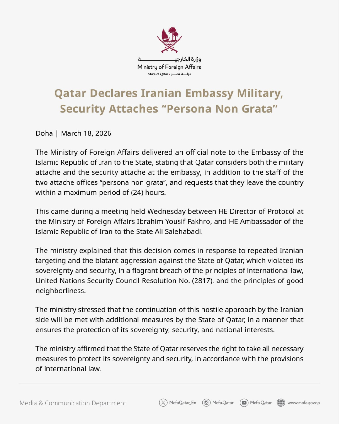Το υπουργείο εξήγησε ότι η απόφαση αυτή έρχεται σε απάντηση στις επανειλημμένες ιρανικές στοχοποιήσεις και την κατάφωρη επιθετικότητα κατά του Κράτους του Κατάρ, η οποία παραβίασε την κυριαρχία και την ασφάλειά του, σε μια κατάφωρη παραβίαση των αρχών του διεθνούς δικαίου, του ψηφίσματος αριθ. (2817) του Συμβουλίου Ασφαλείας των Ηνωμένων Εθνών και των αρχών της καλής γειτονίας.
